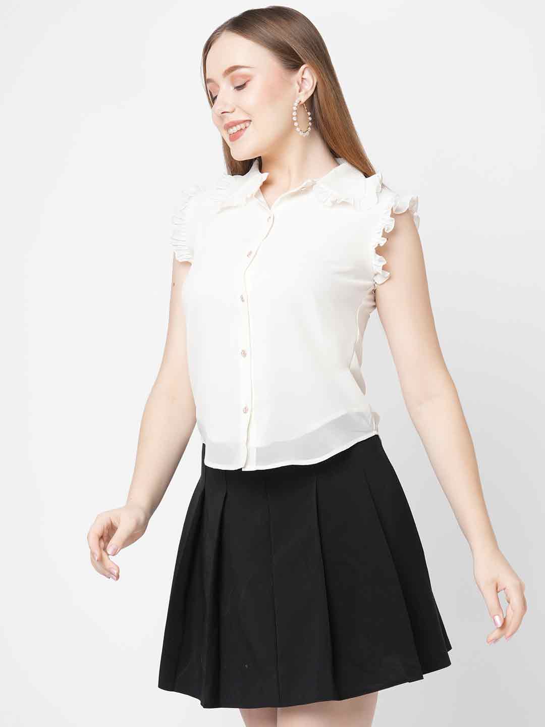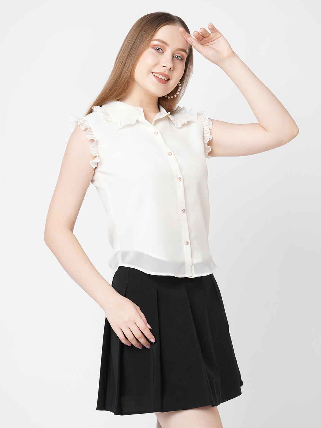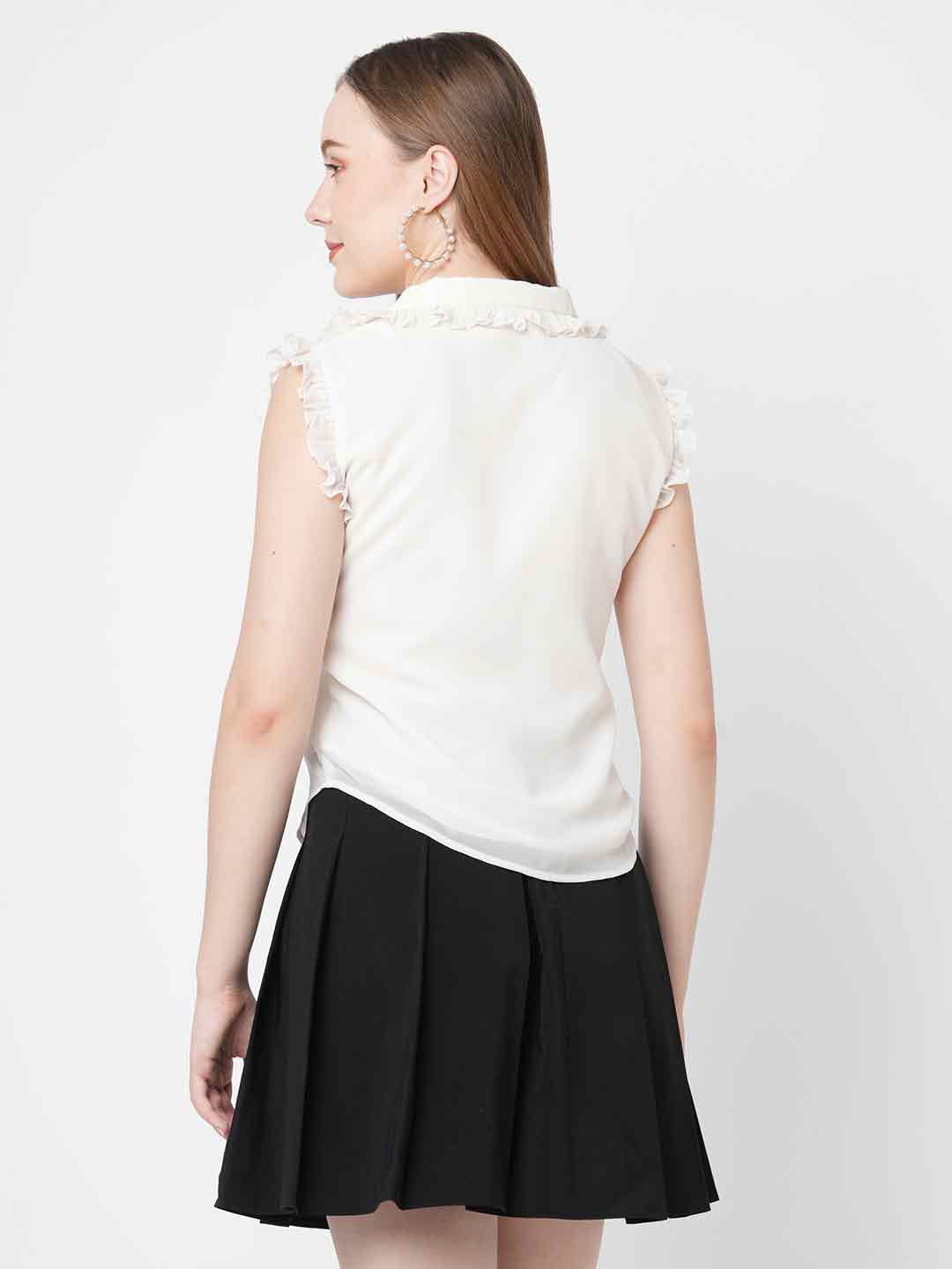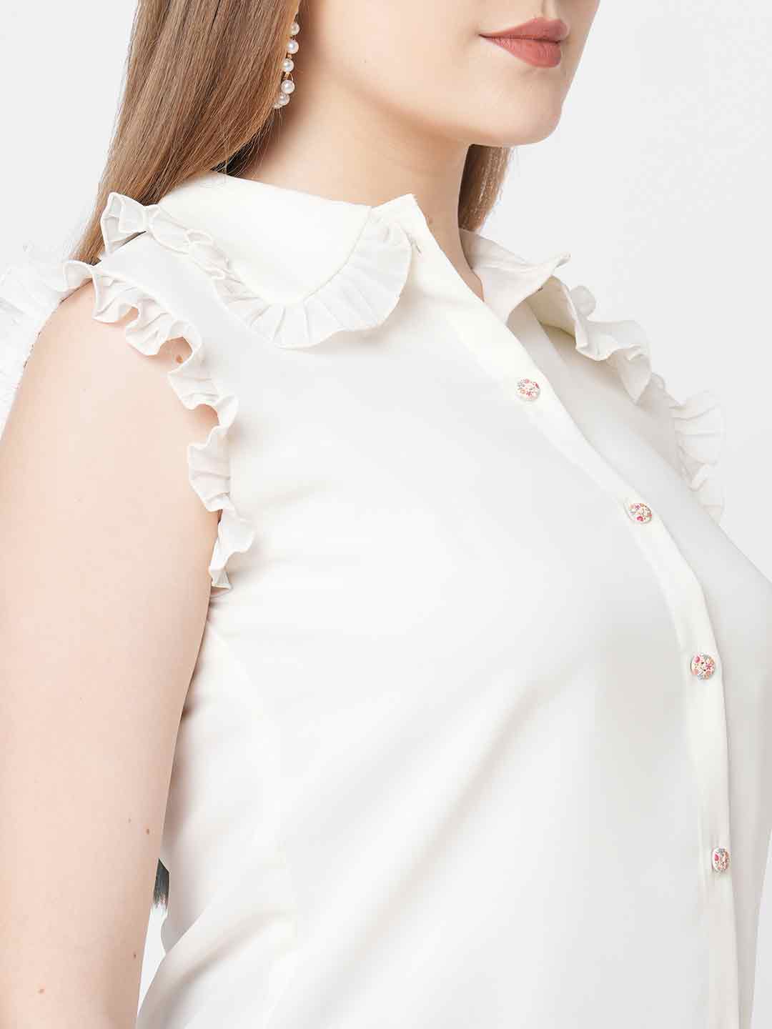 Off white solid button up style sleeveless shirt with ruffle detail on collar