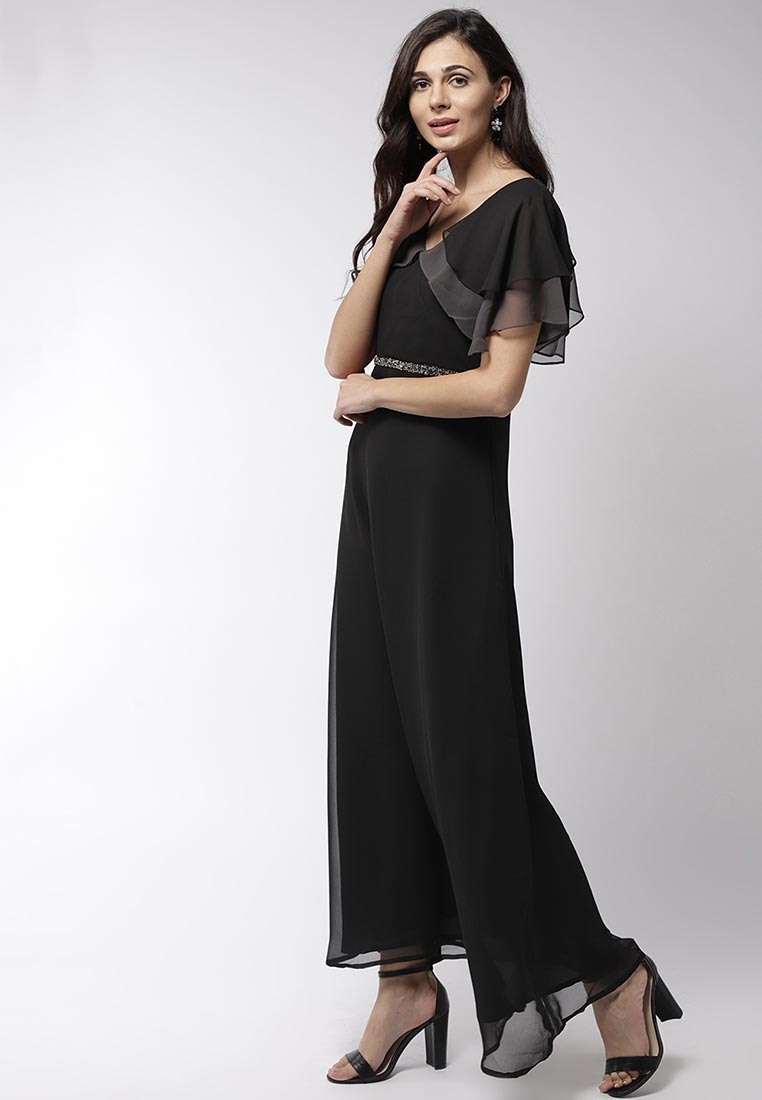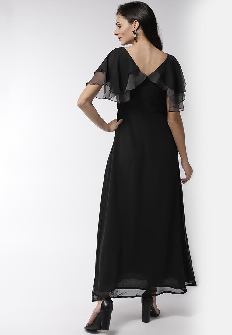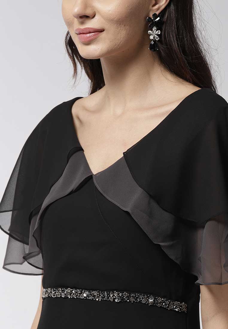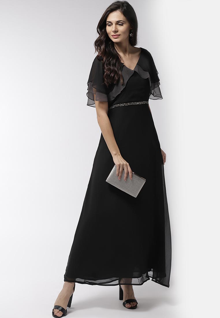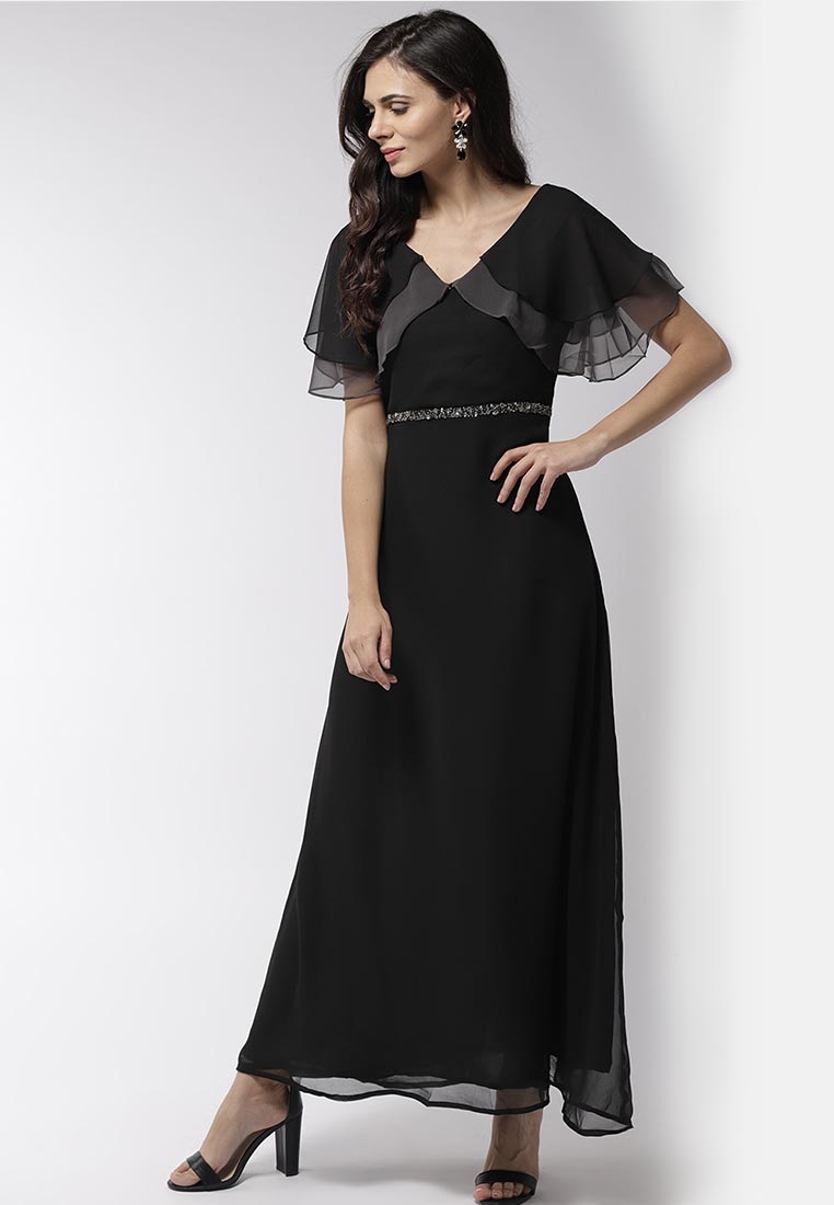 Black solid woven layered maxi dress, has a V-neck, short sleeves, concealed zip closure, an attached lining, flared hem, embellished and sequinned detail