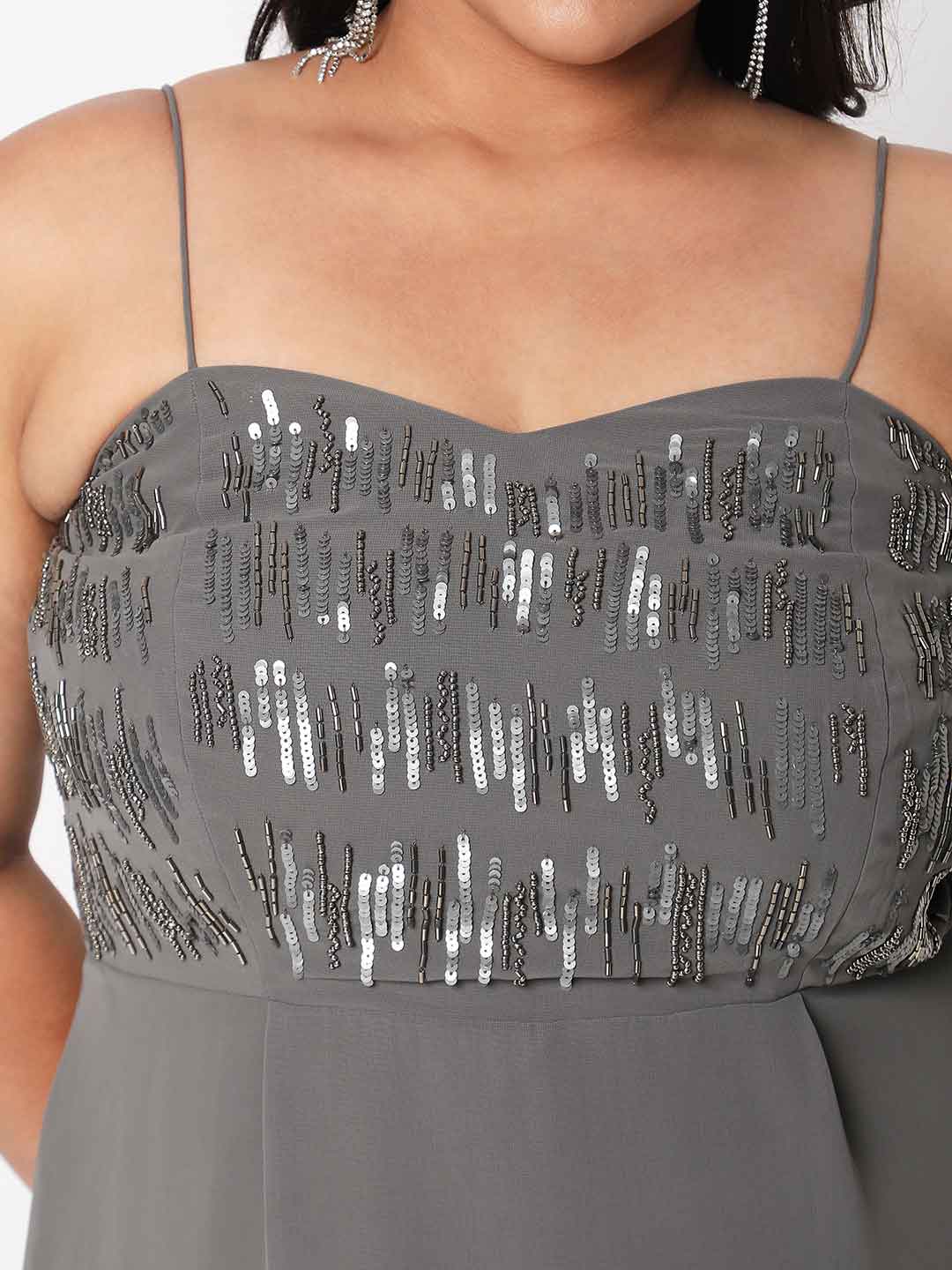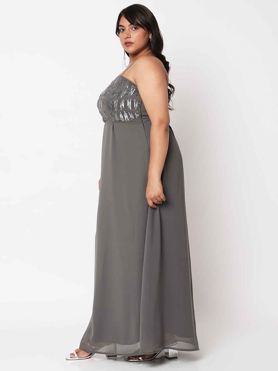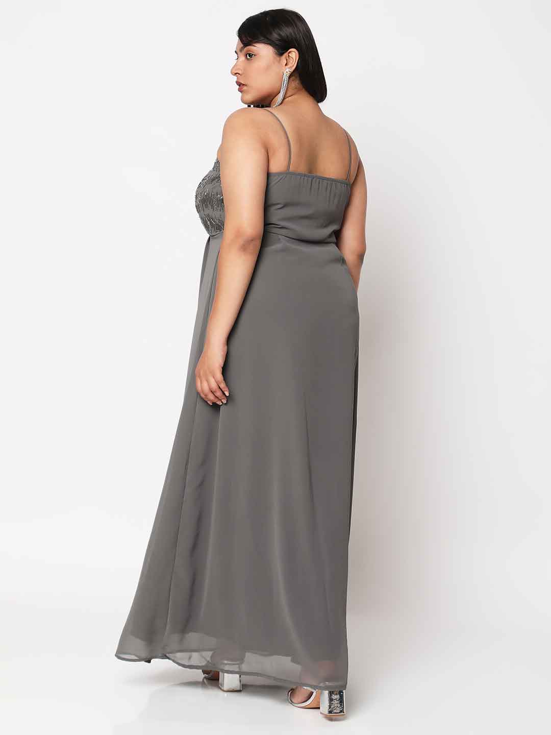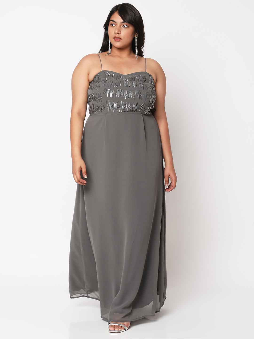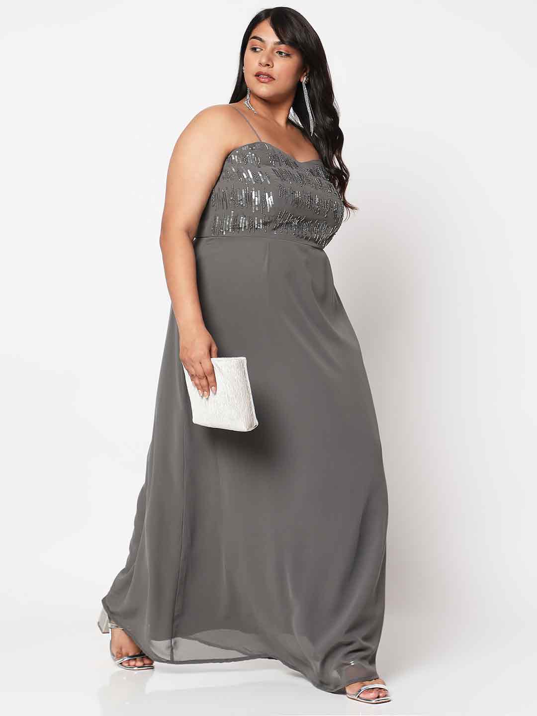 Charcoal embellished shoulder strap maxi dress with flared hem
