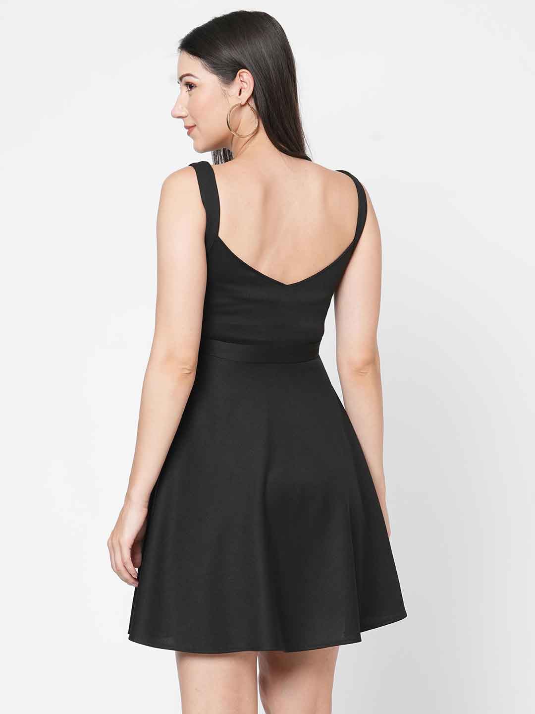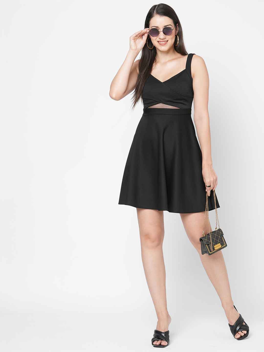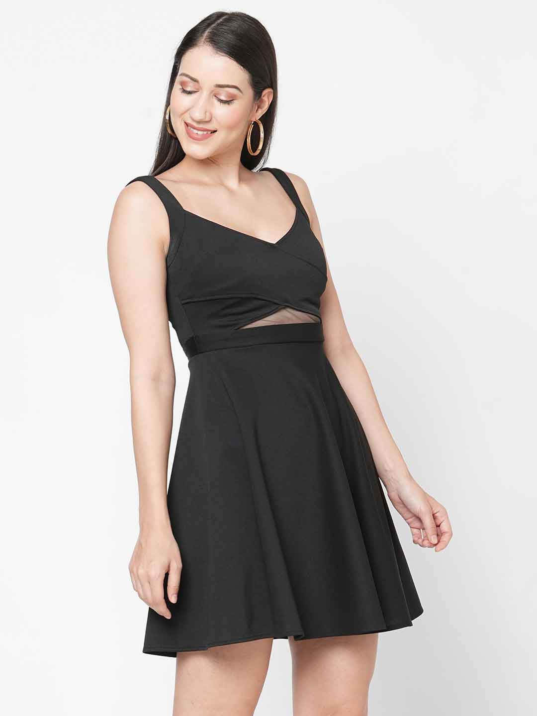 Black solid scuba V neckline criss cross detail and cut out with net insert style fit and flare short dress