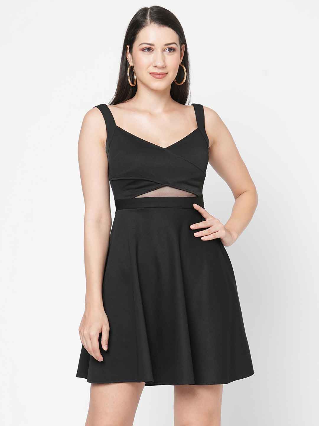 Black solid scuba criss cross detail and cut out with net insert style fit and flare short dress
