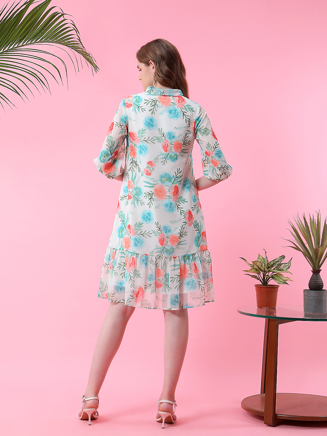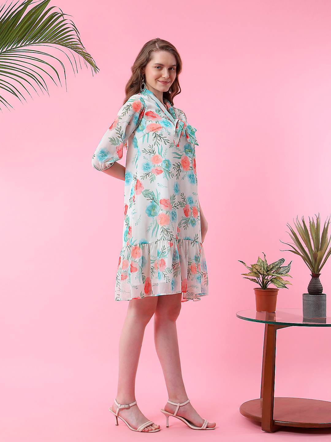 Light green floral printed dress with neck tie-up and gathered layer at the hem