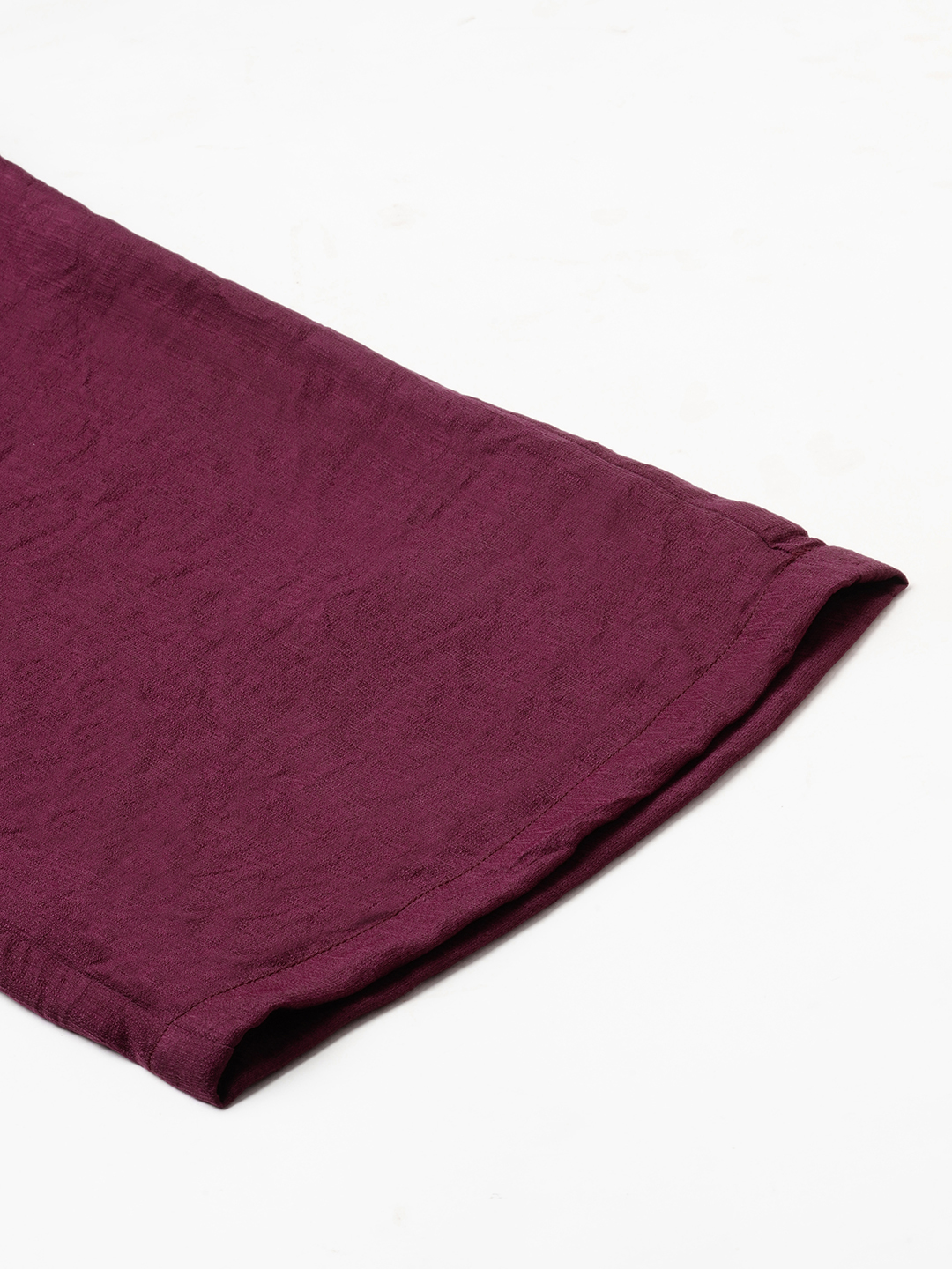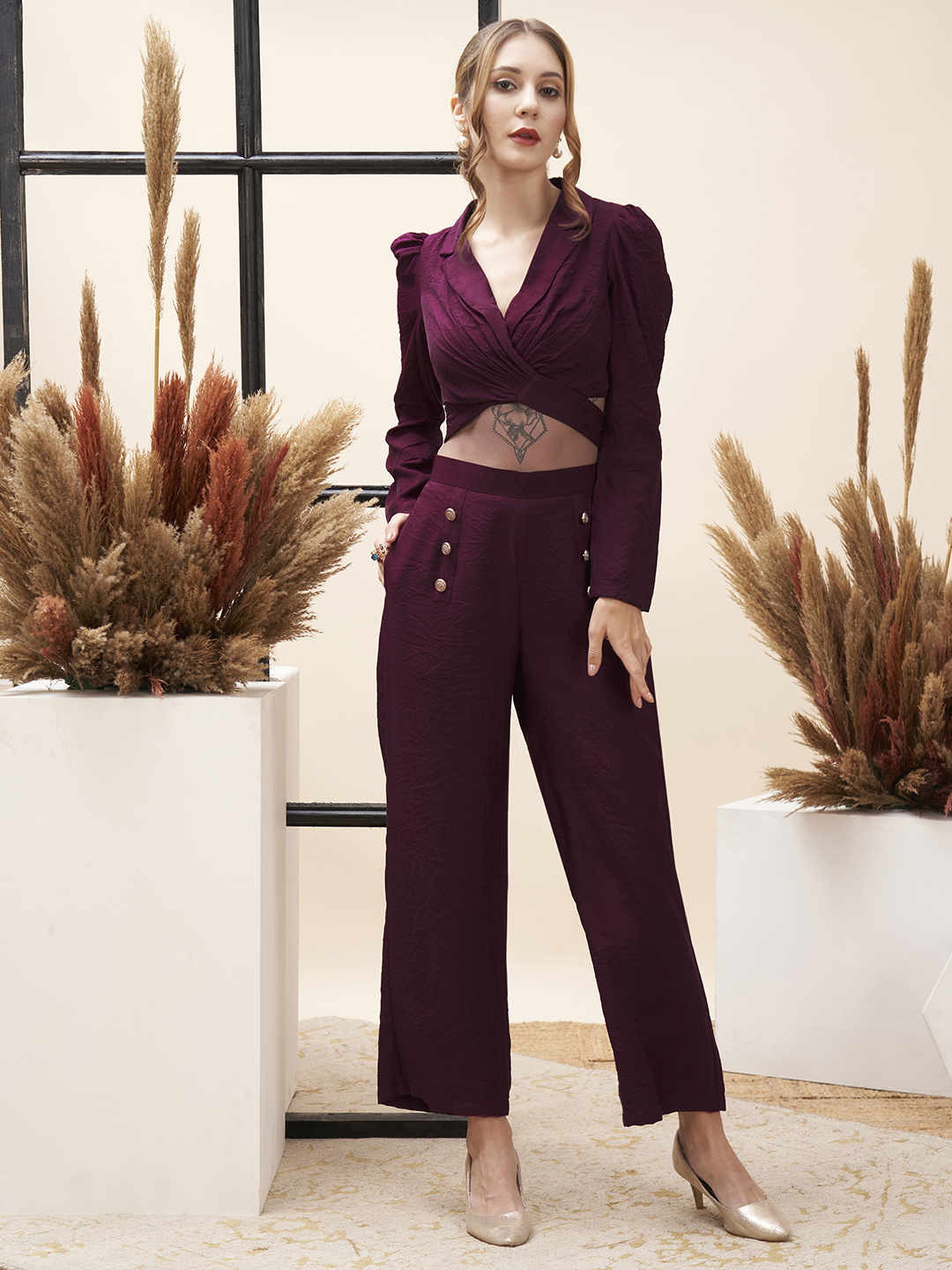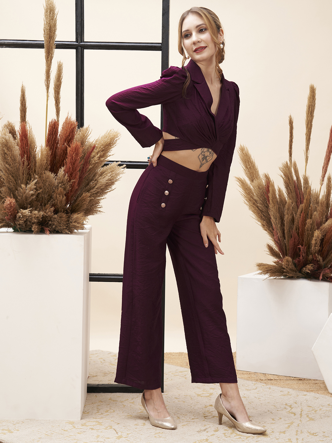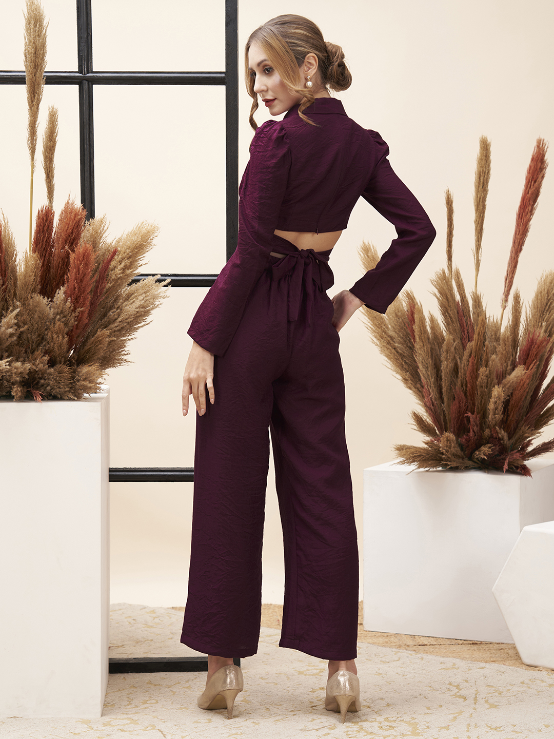 Straight fit pants with a solid maroon V-neck top with back tie