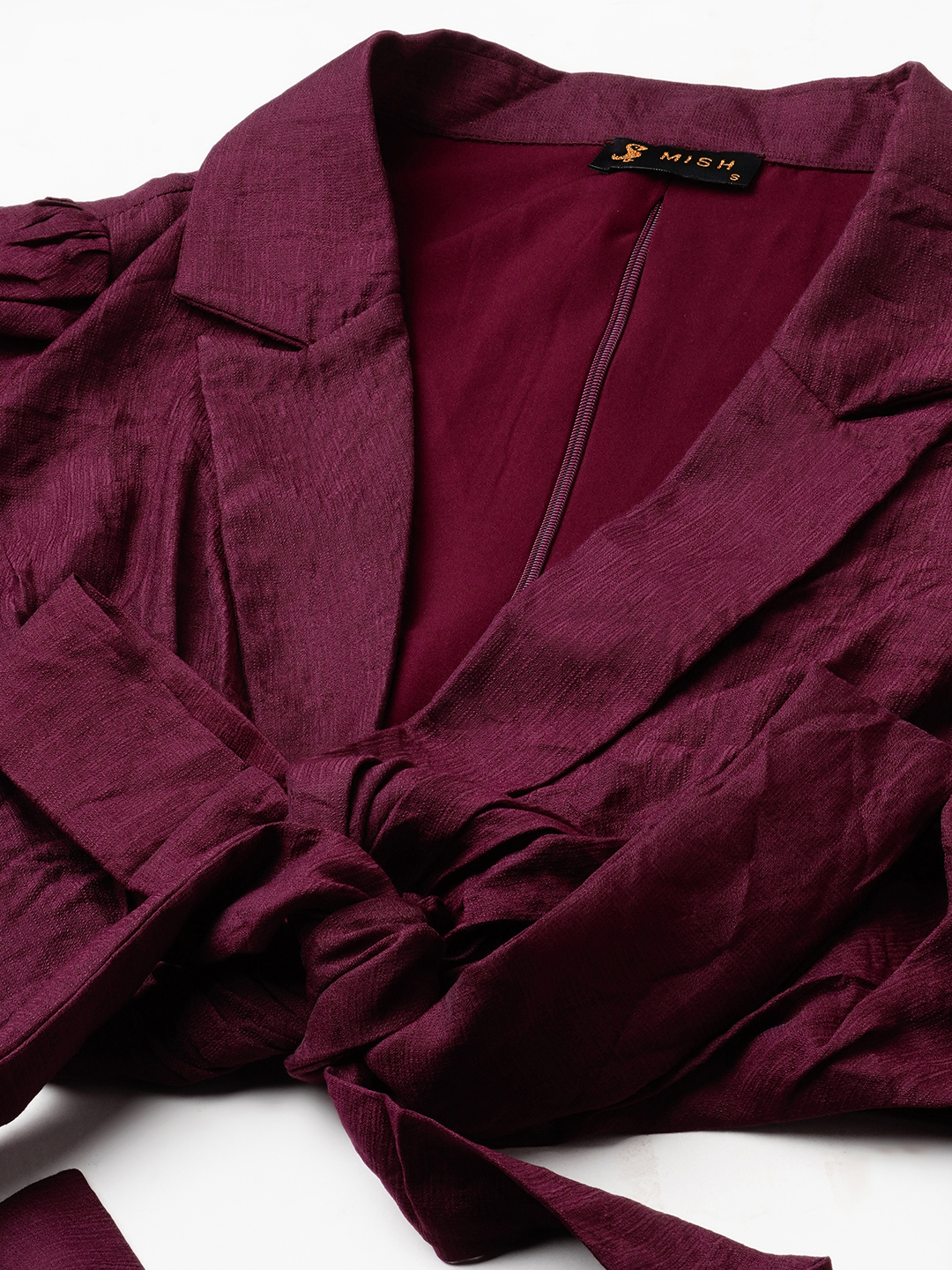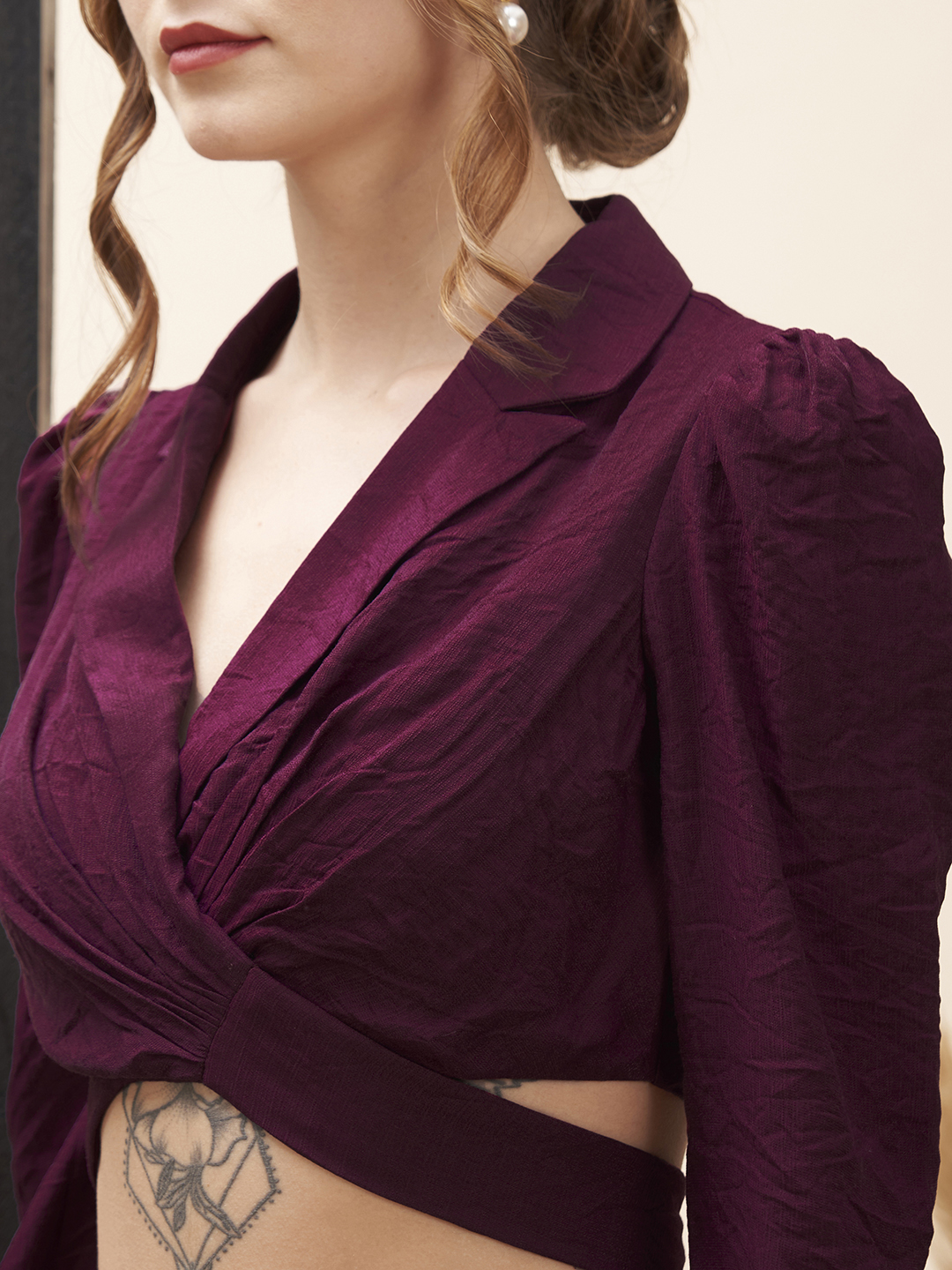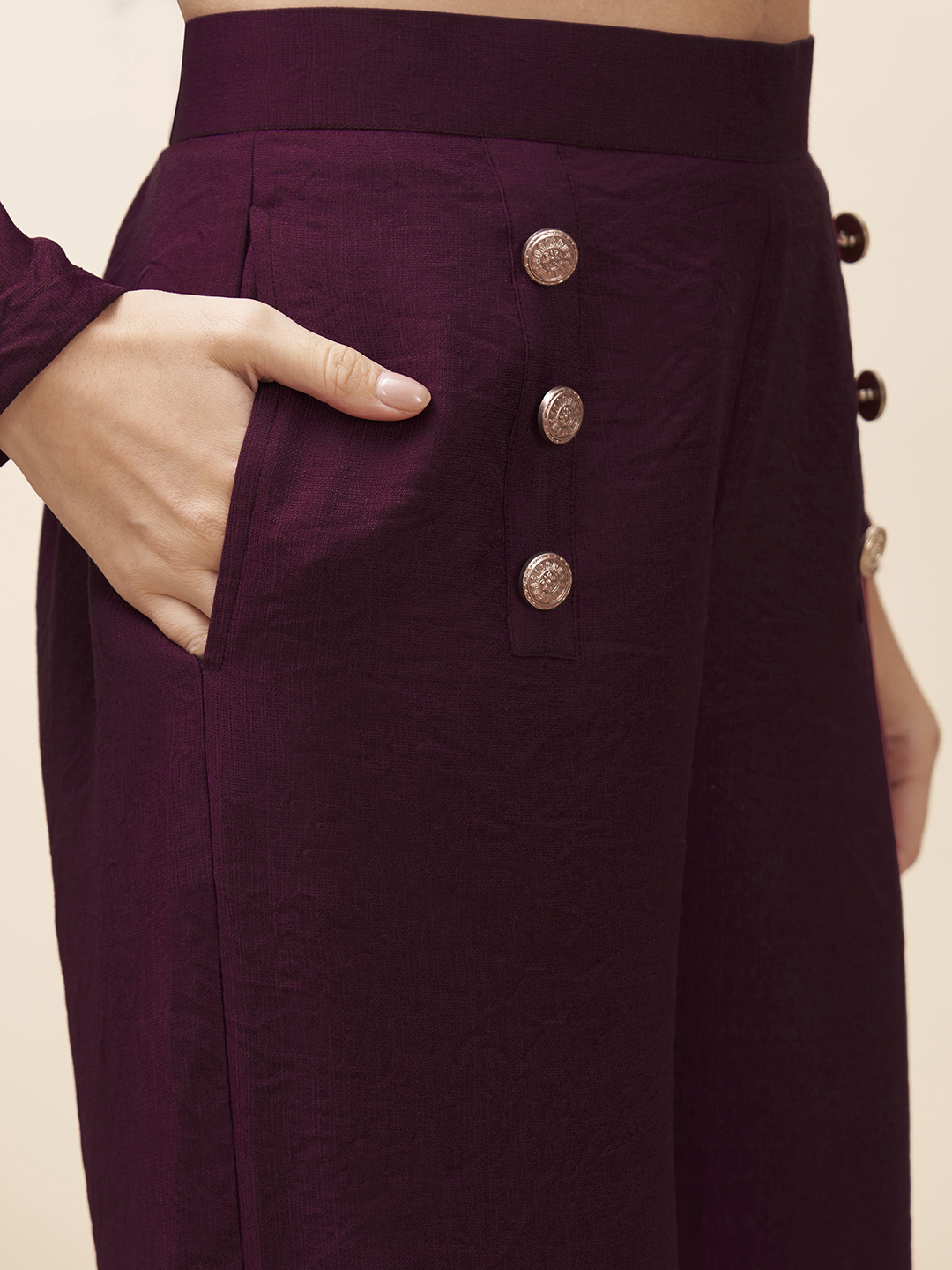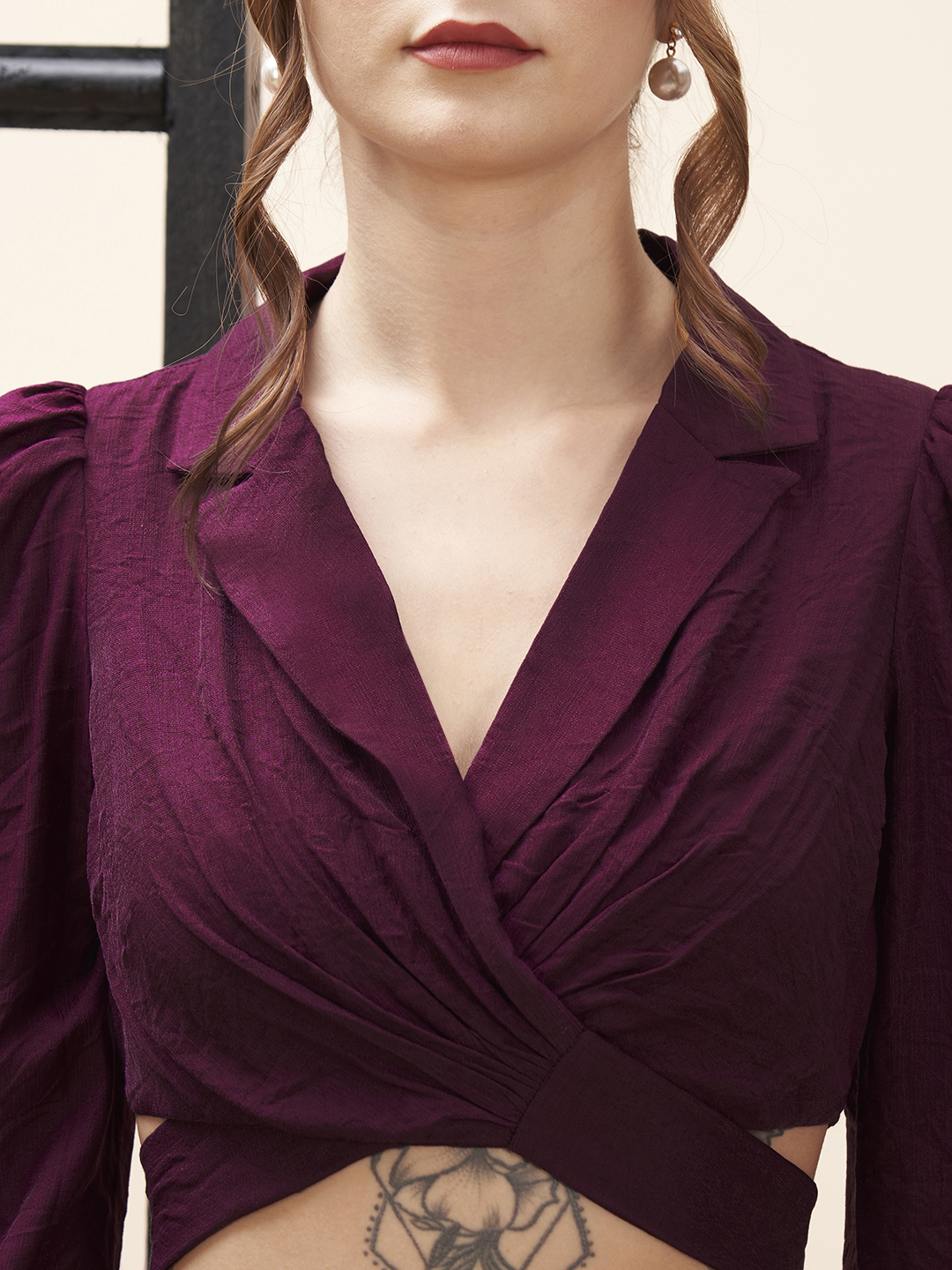 Straight fit pants with a solid maroon V-neck top with back tie
