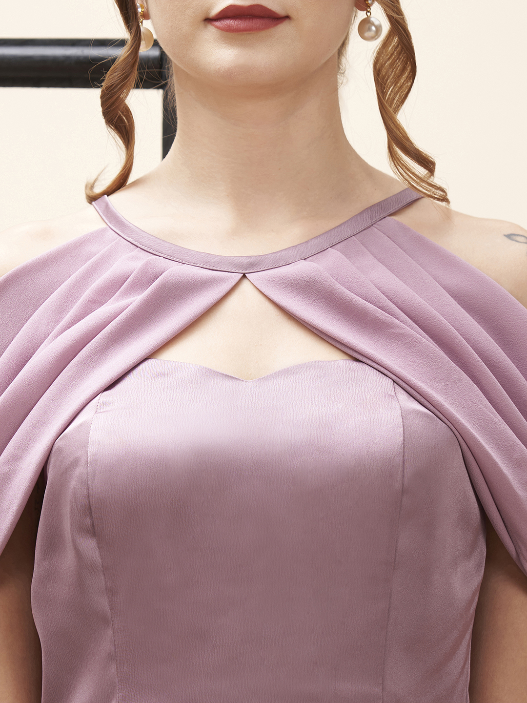 Transparent strap mini dress with a detachable pleated cowl capes which falls on each shoulder