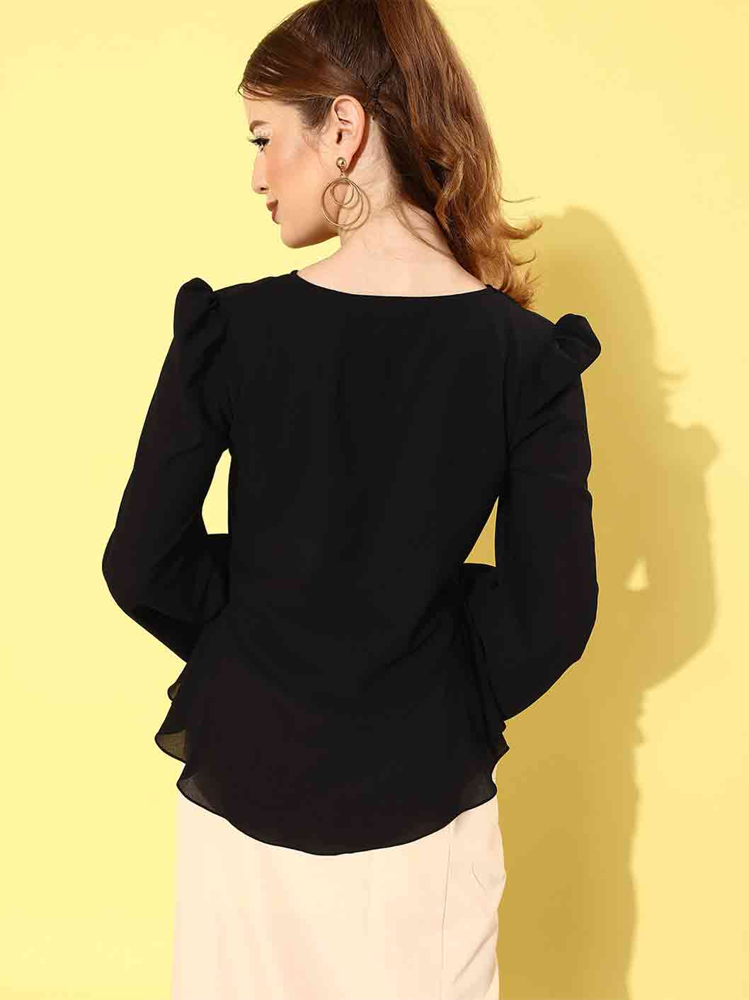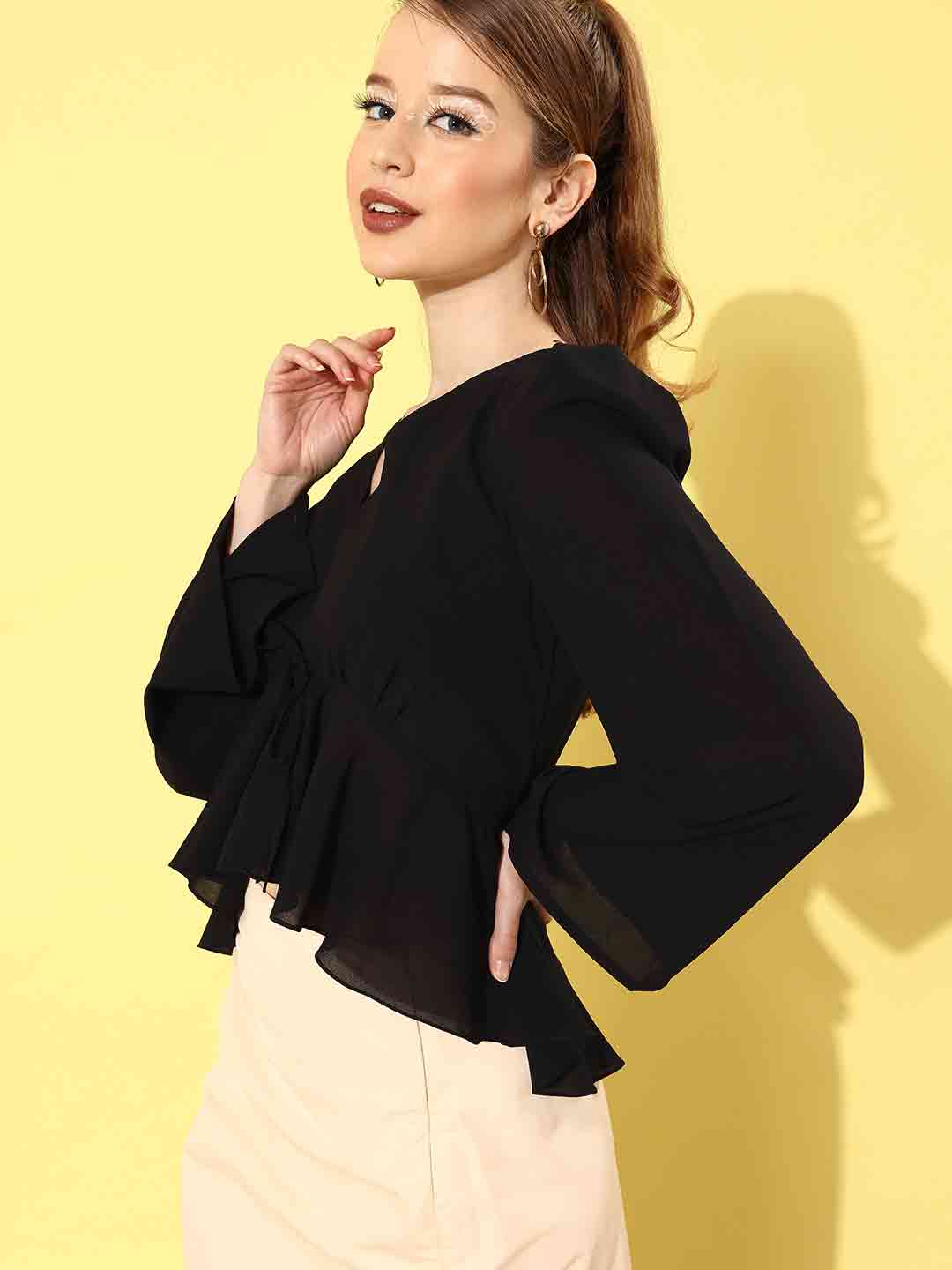 Black peplum style draw string tie-up detail front high low with long flared sleeve top