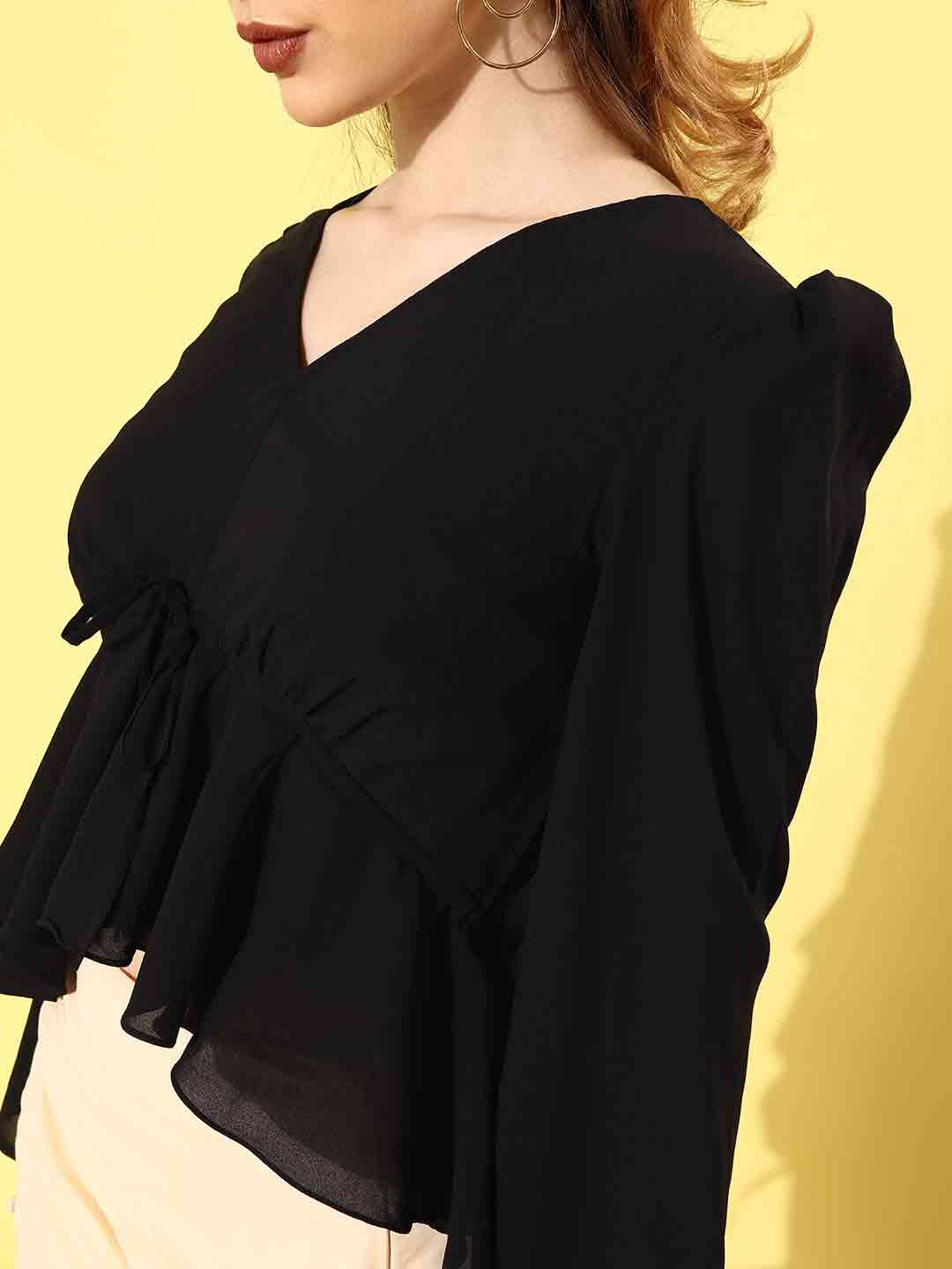 Peplum highlow top with tie-up detail and flared sleeves
