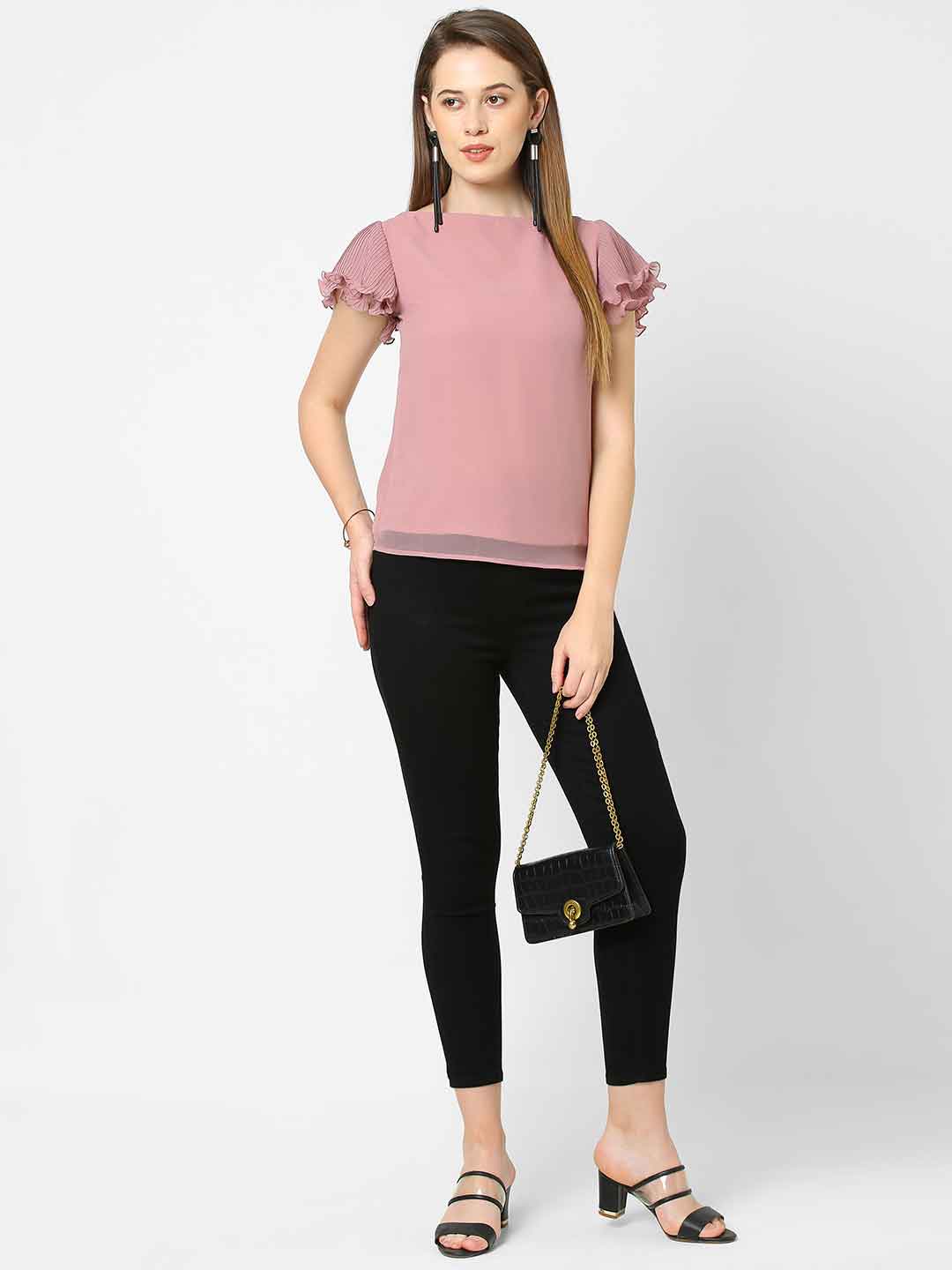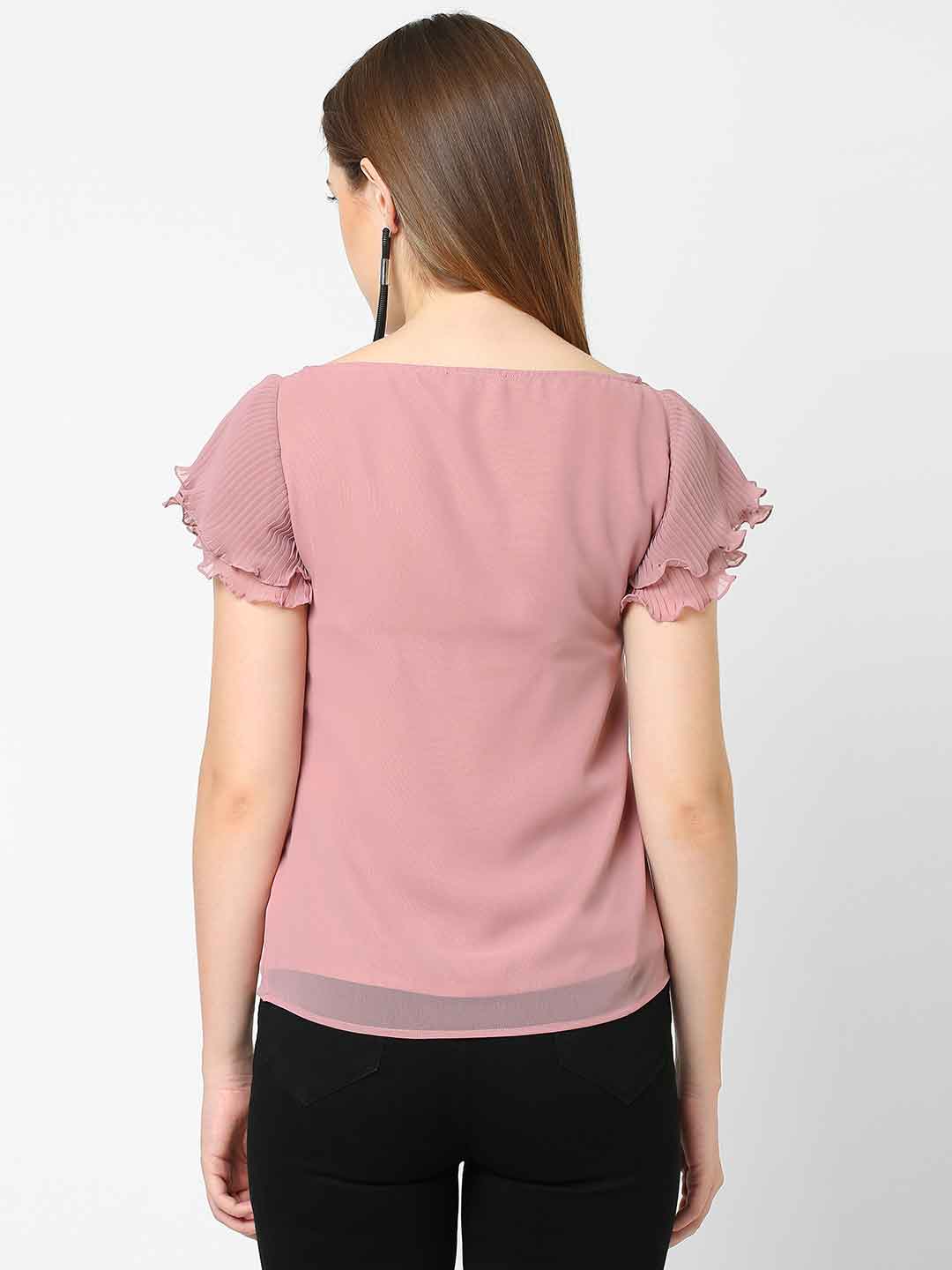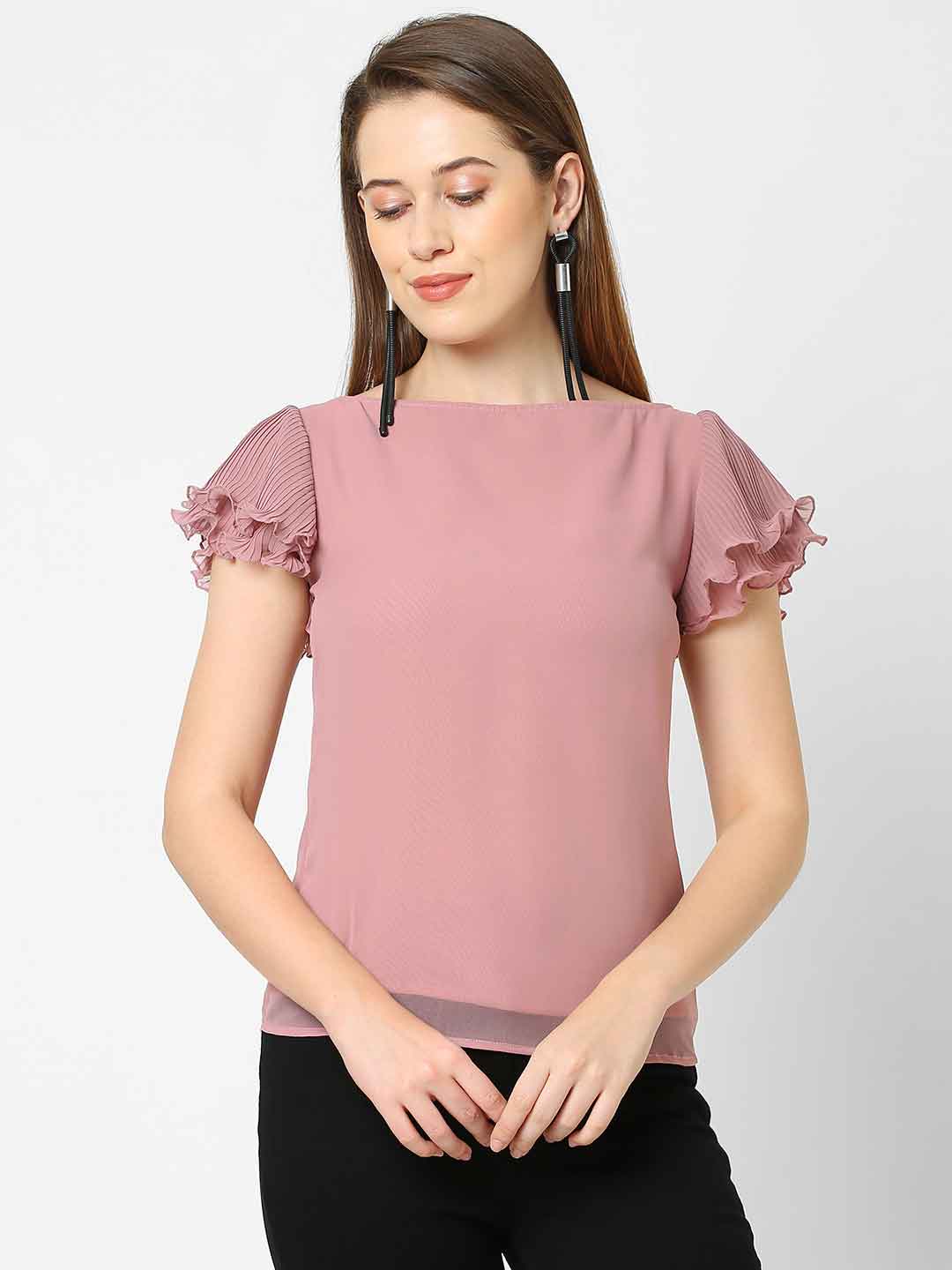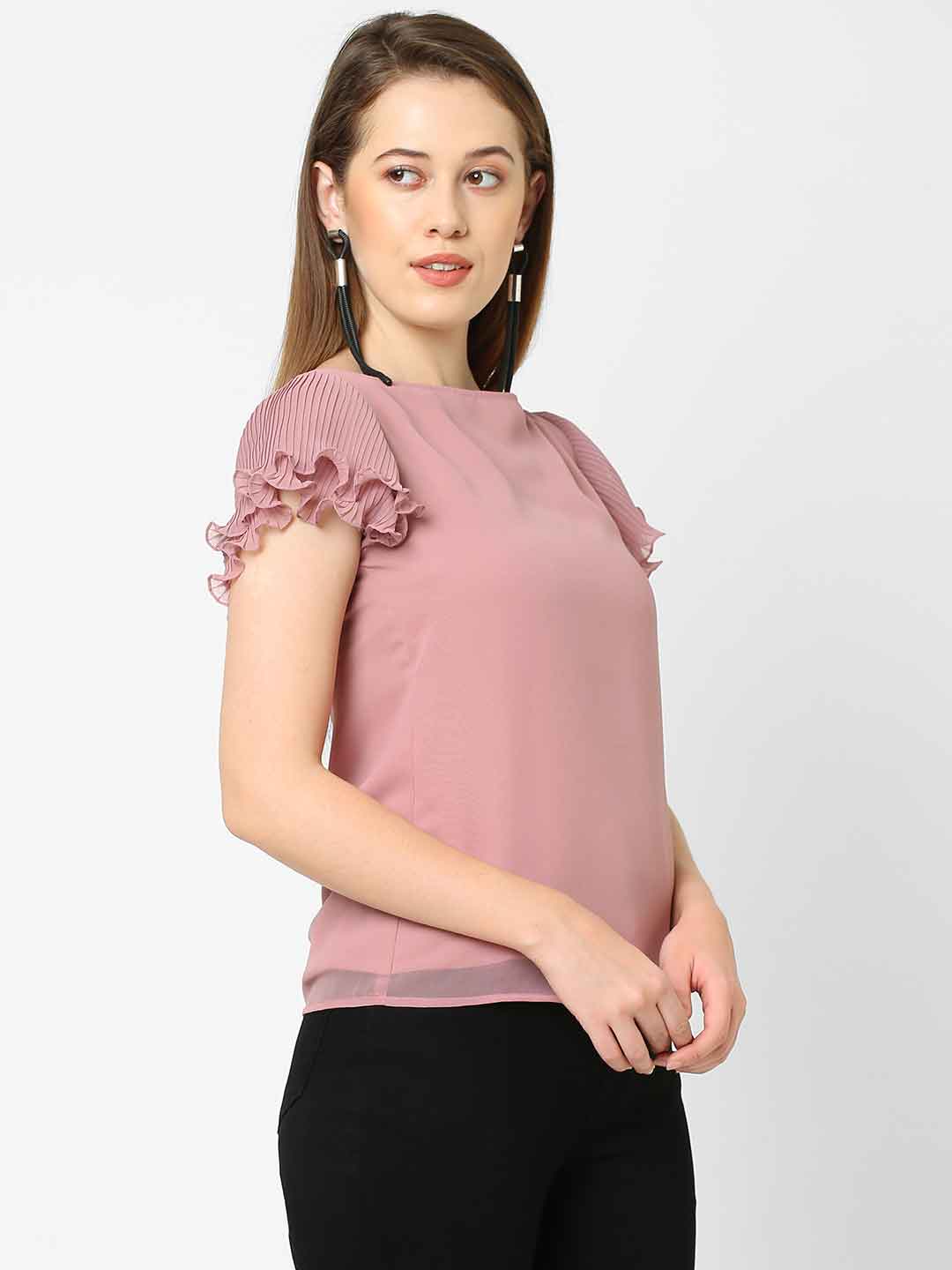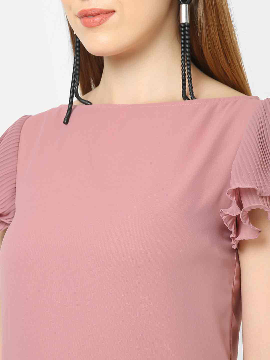 Rose pink solid pleated layer flared short sleeve has a boat neck regular top
