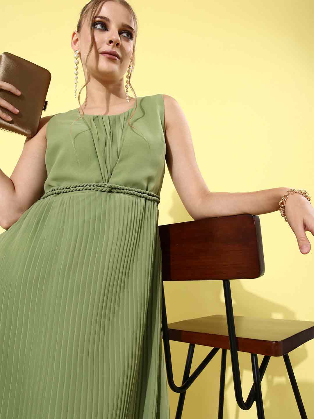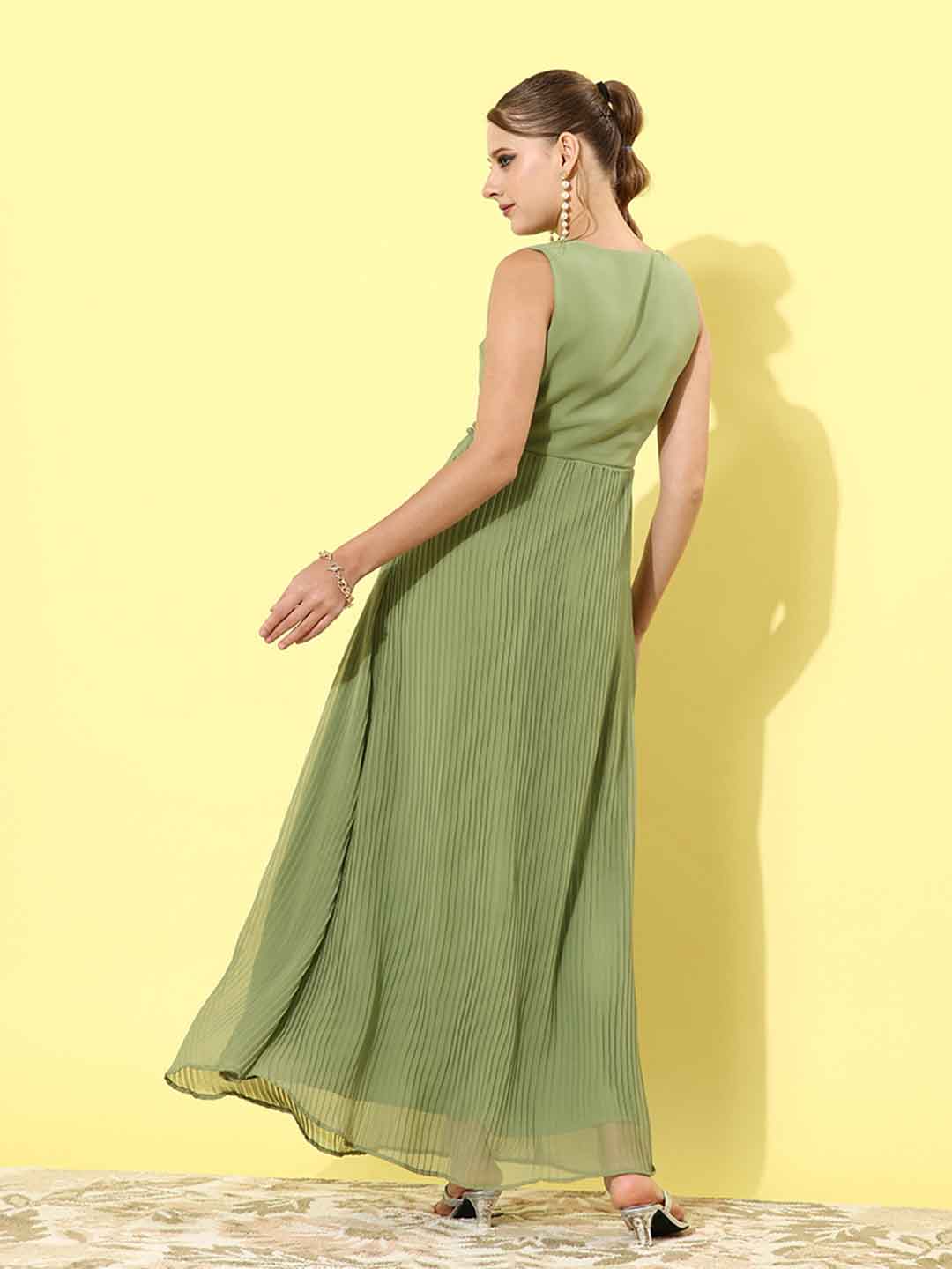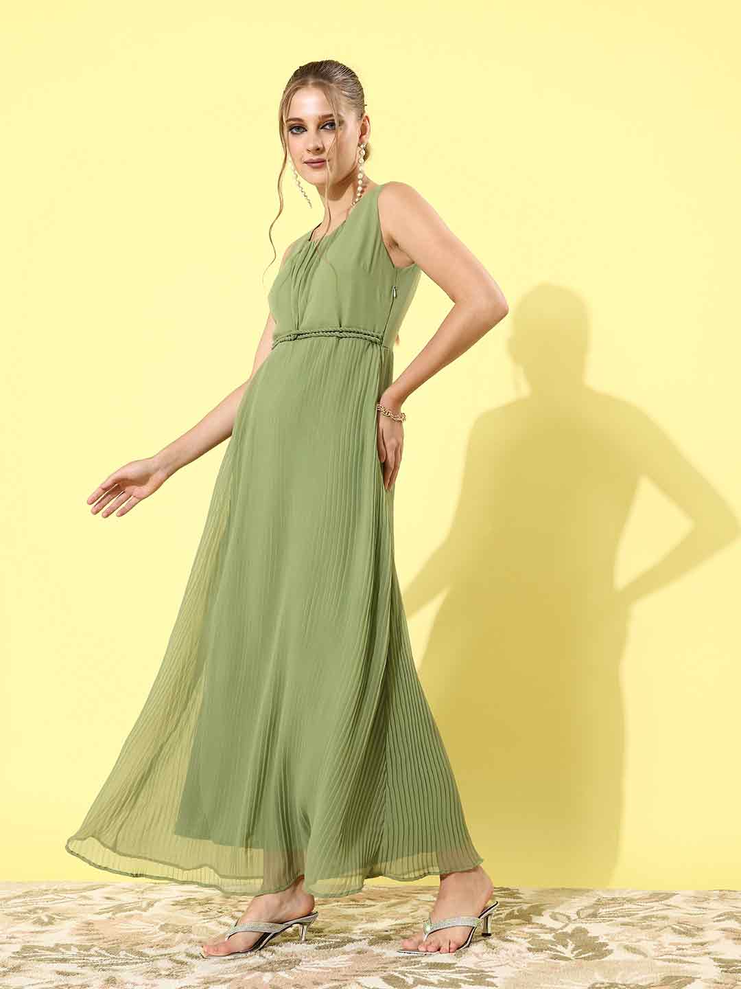 Sea green solid color with pleated bottom and rushed detail at the top with sheer neckline at the centre and stylised belt maxi dress