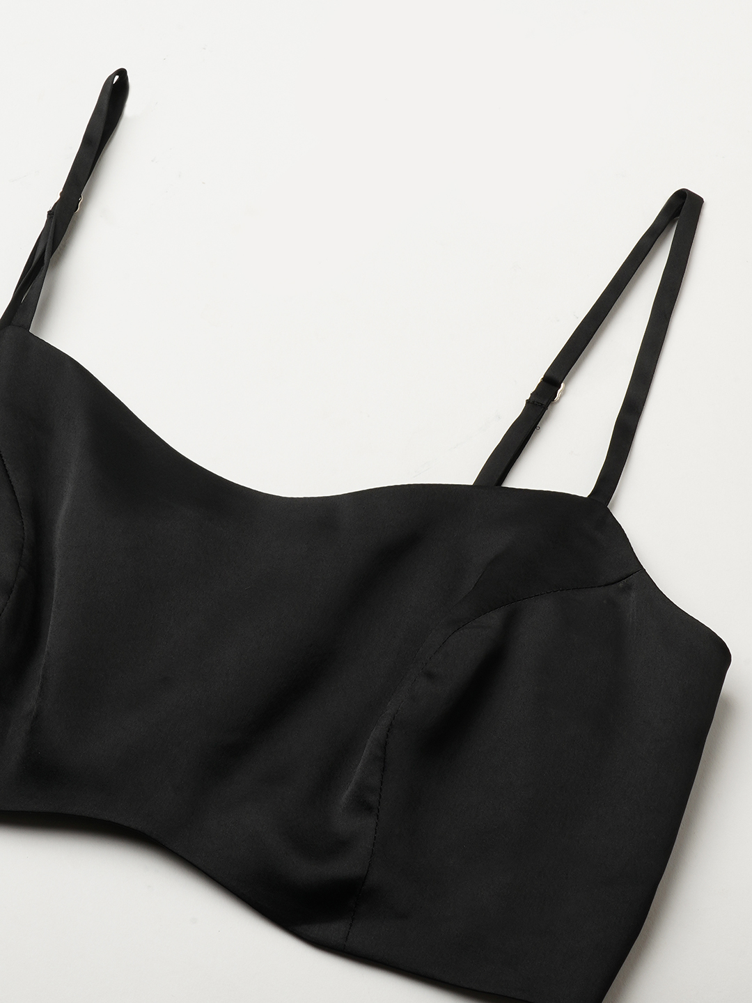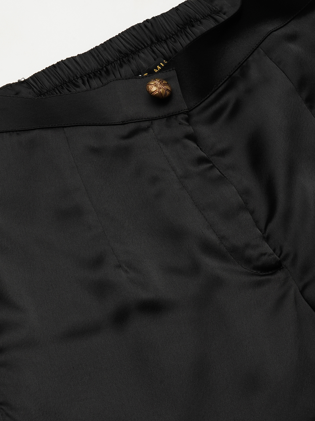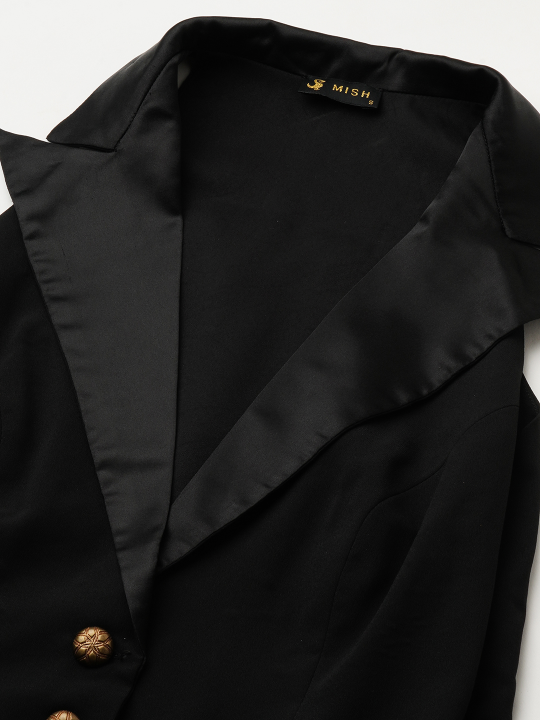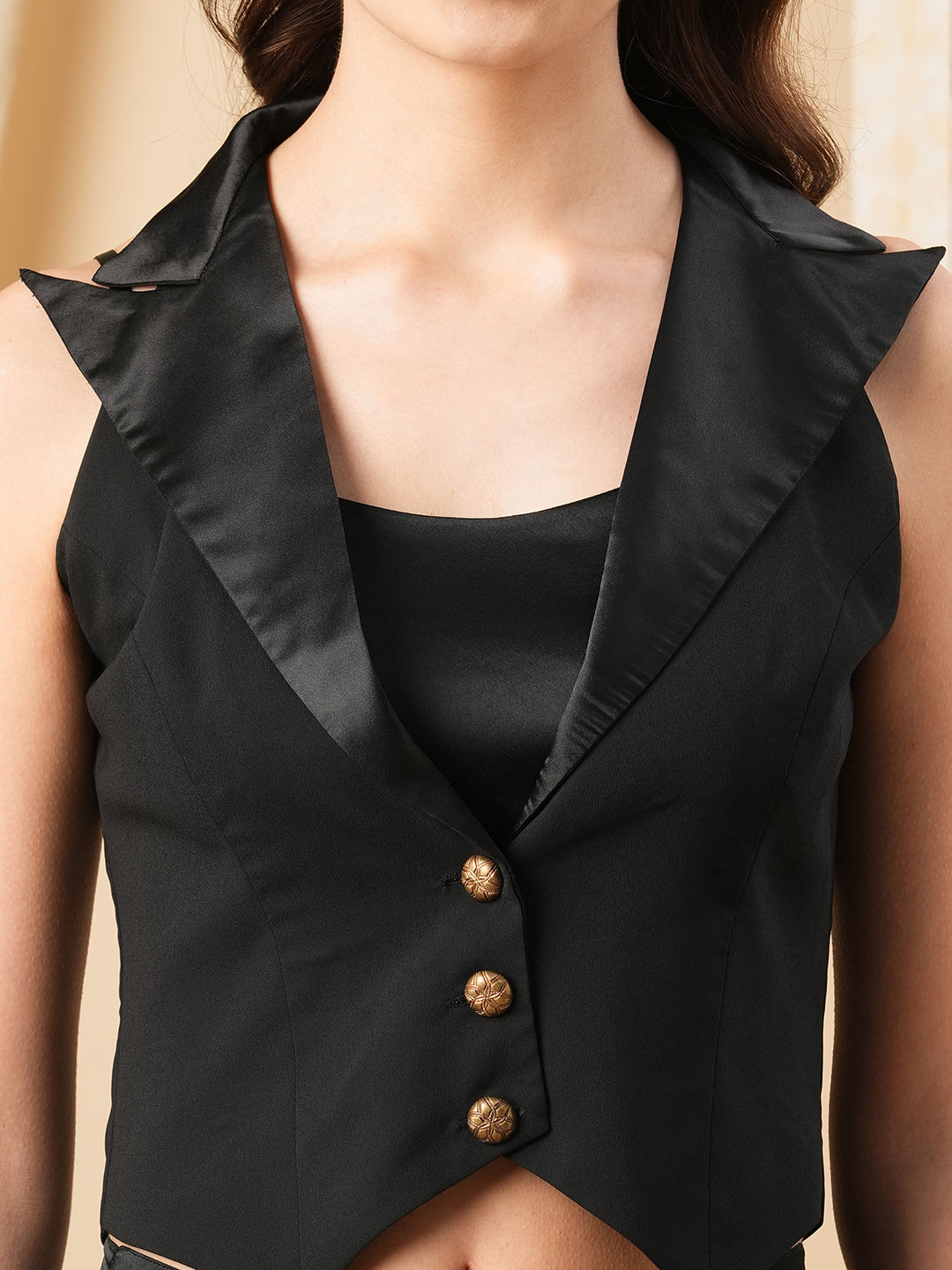Matching satin pants and a black sleeveless coat-style top with a lapel collar and an inside slip