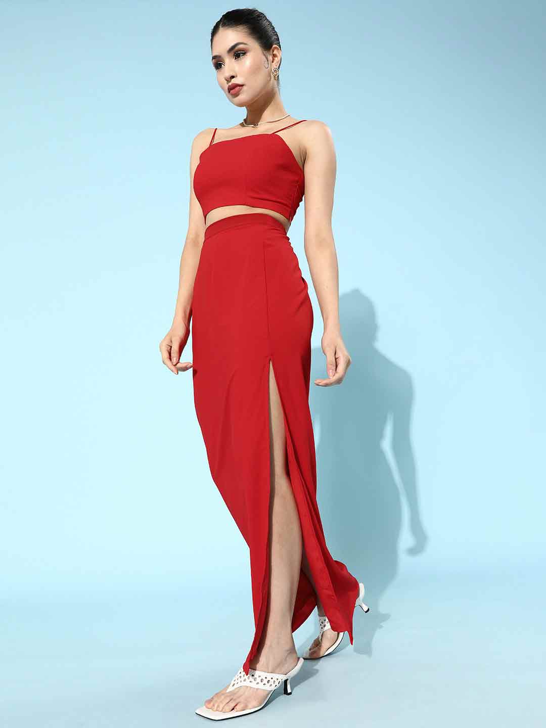 Red solid color embellished shoulder strap crop top with long straight fitted side slit skirt