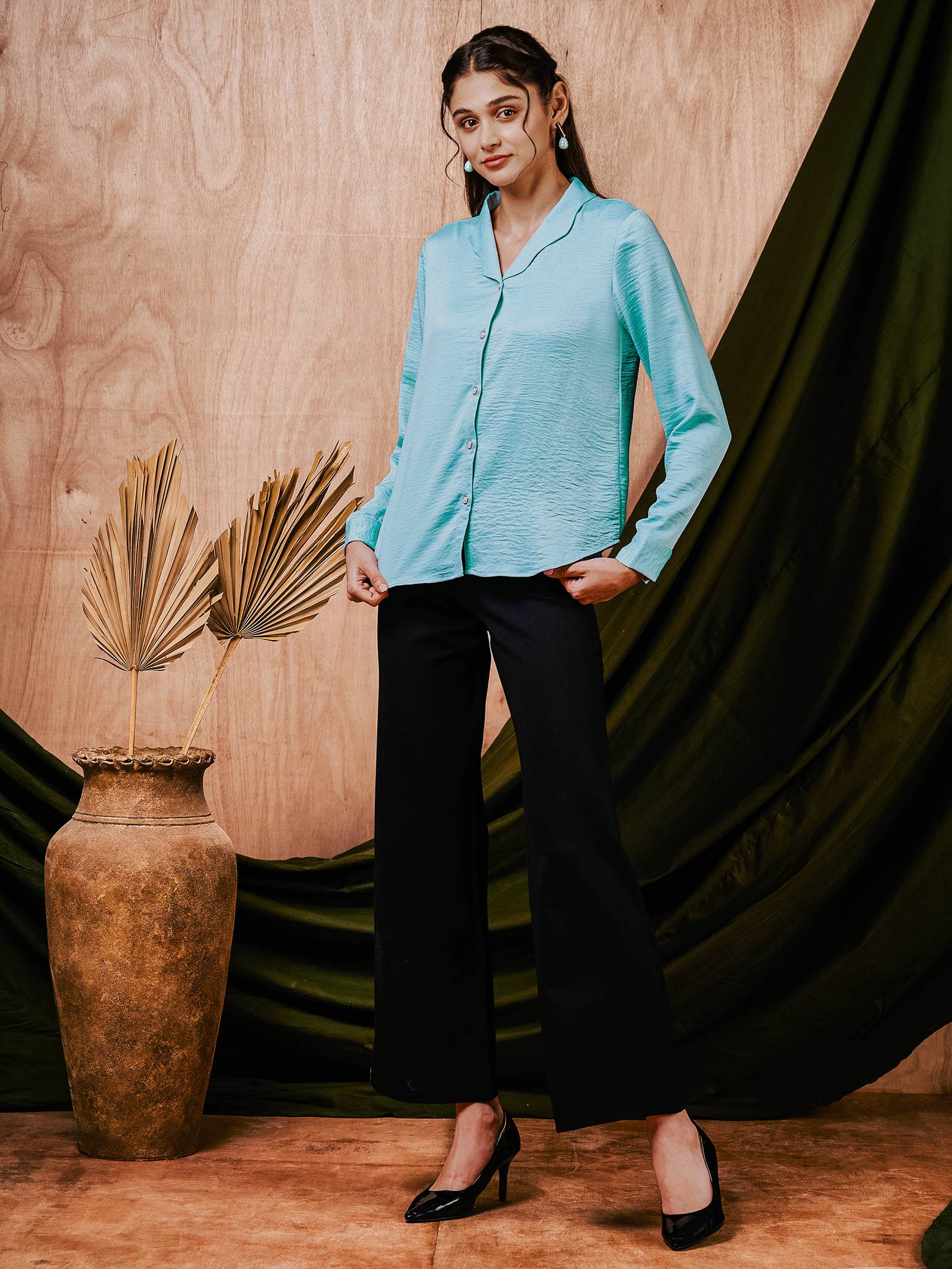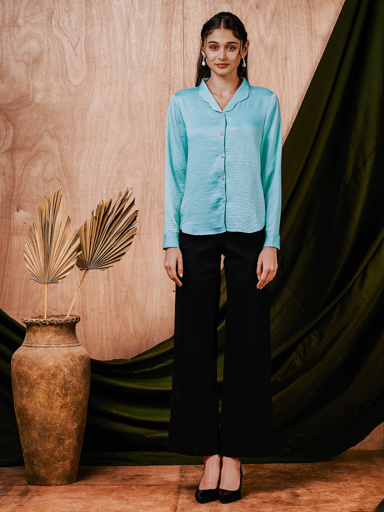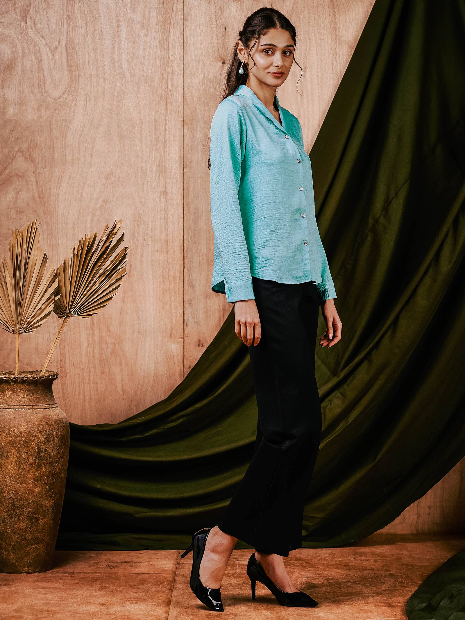 Solid Blue shirt featuring a stylized Cuban collar, regular cuff sleeves, a front opening for easy wear, and an apple cut hemline for a modern touch.