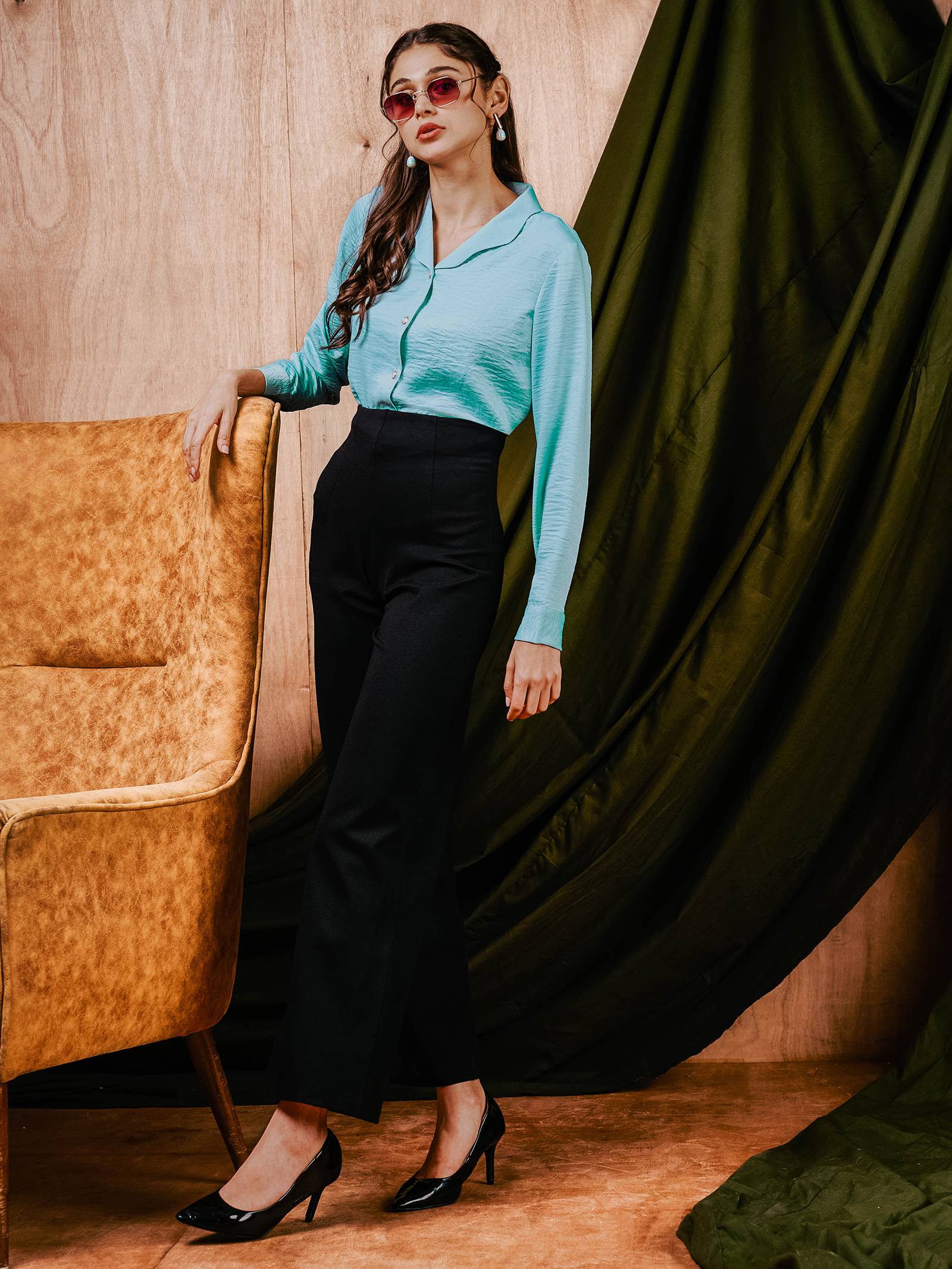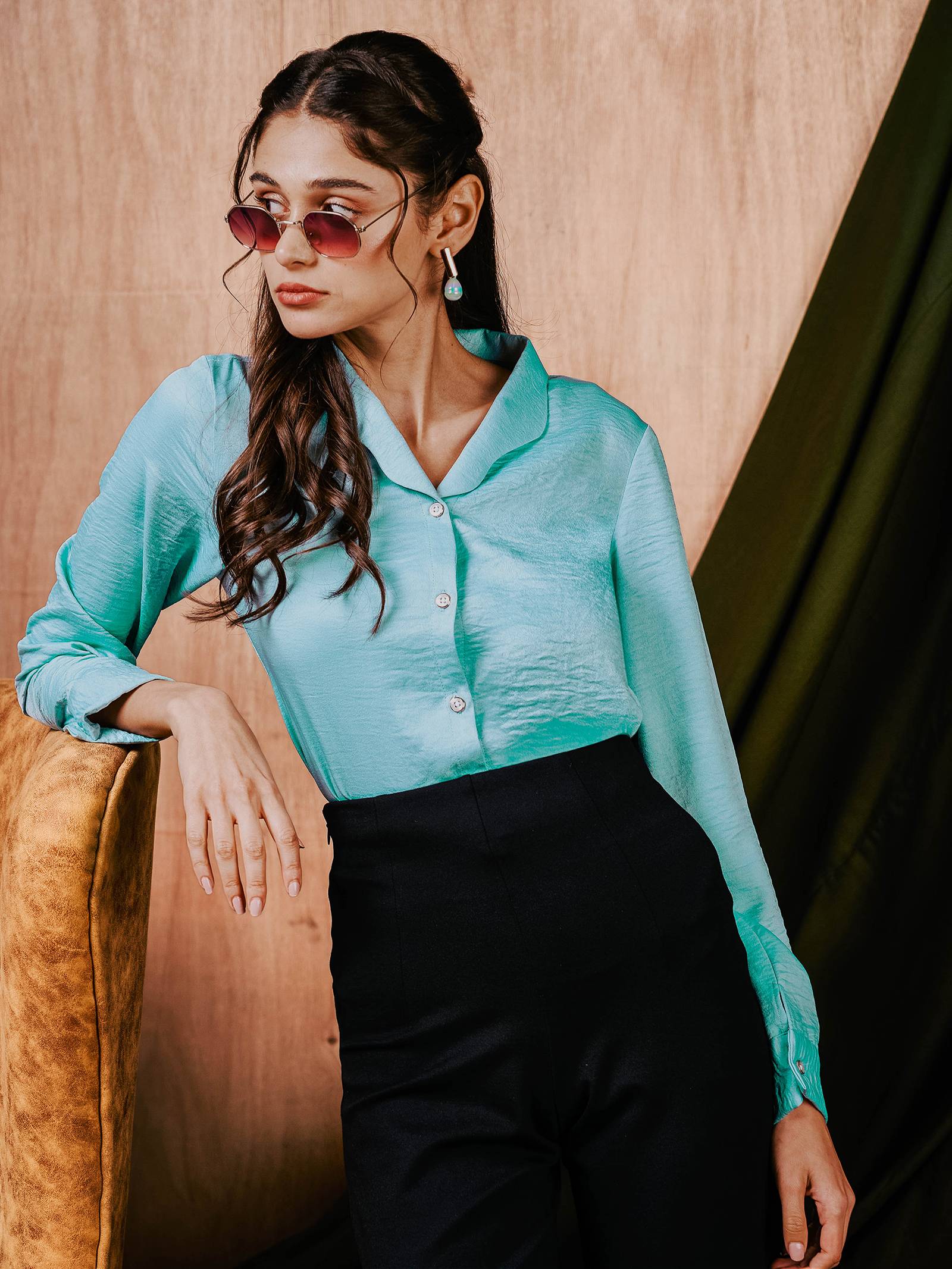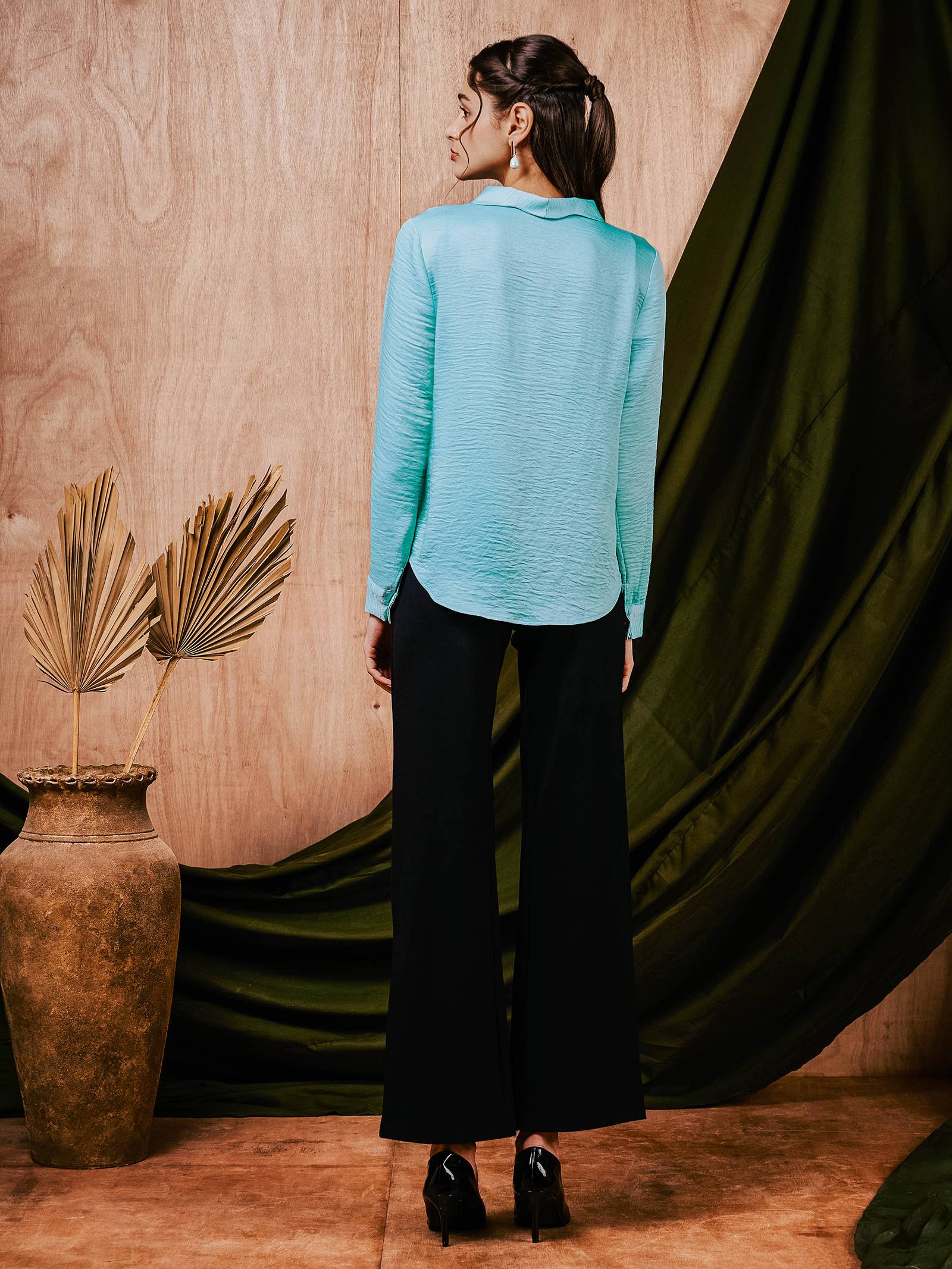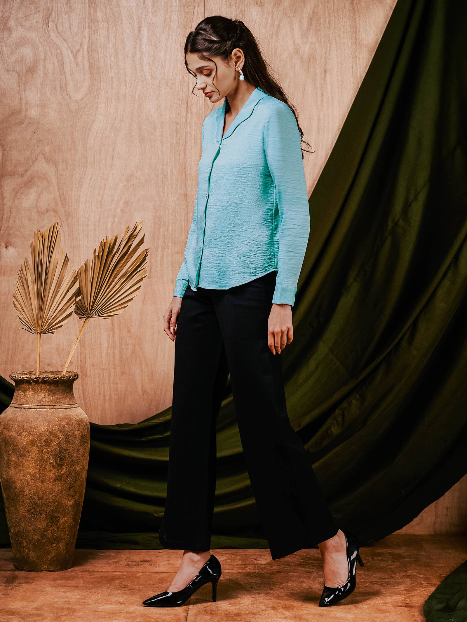 Solid Blue shirt featuring a stylized Cuban collar, regular cuff sleeves, a front opening for easy wear, and an apple cut hemline for a modern touch.
