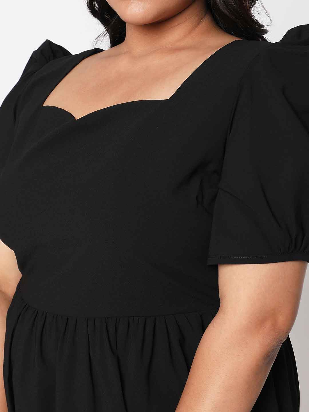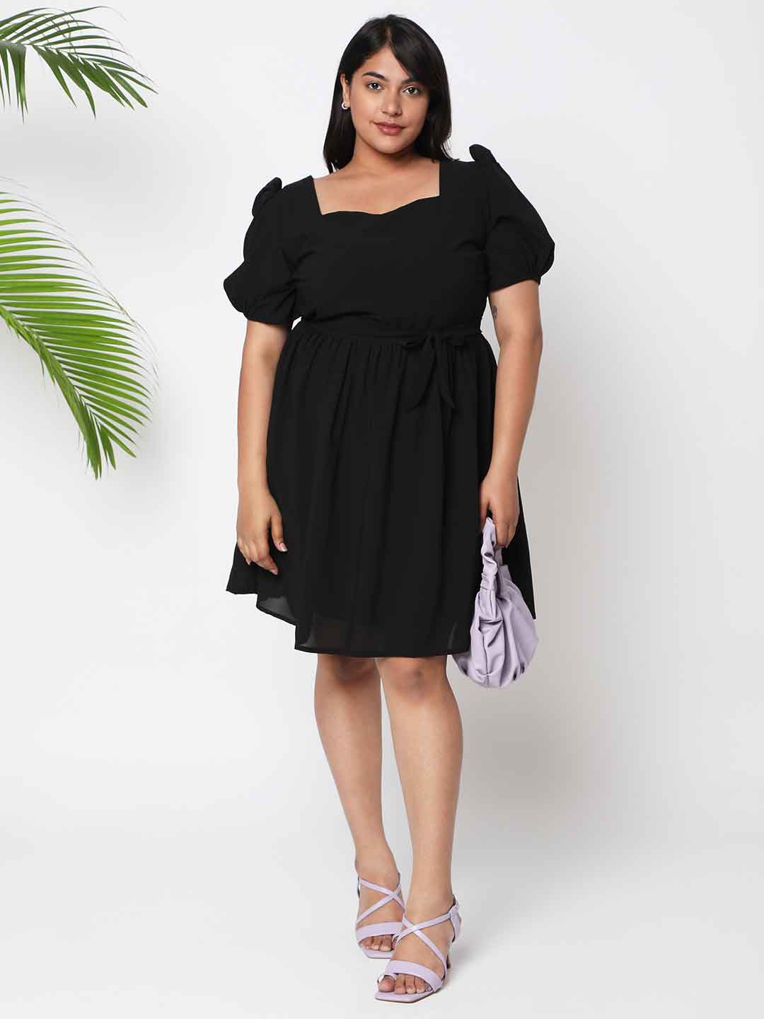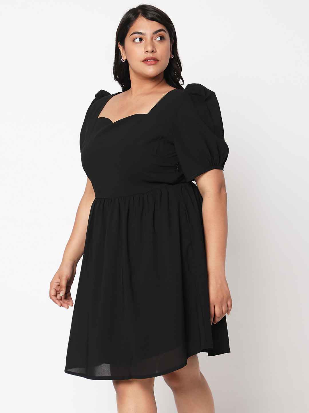 Black solid sweetheart neckline fit and flared dress with belt and flared hem