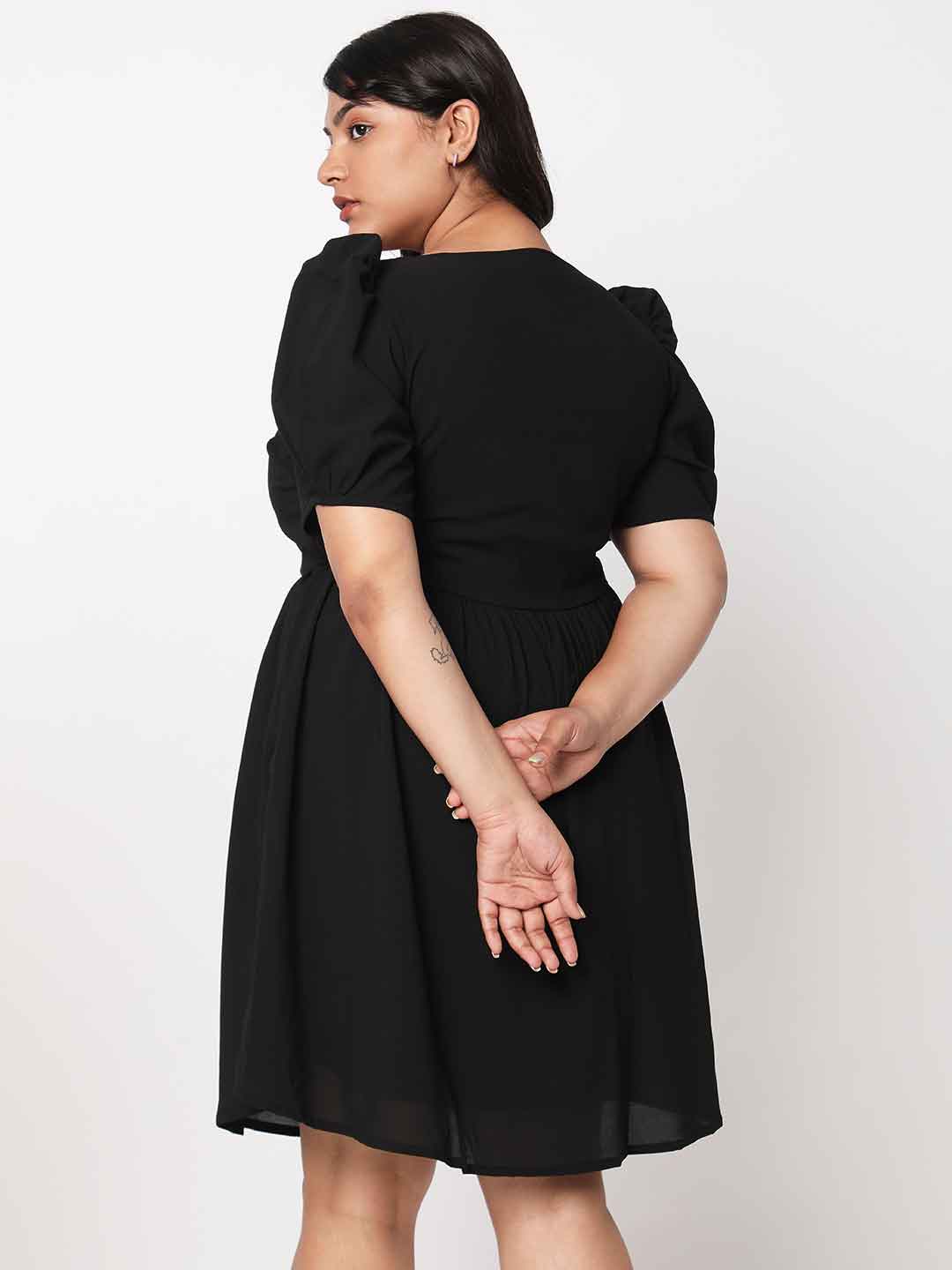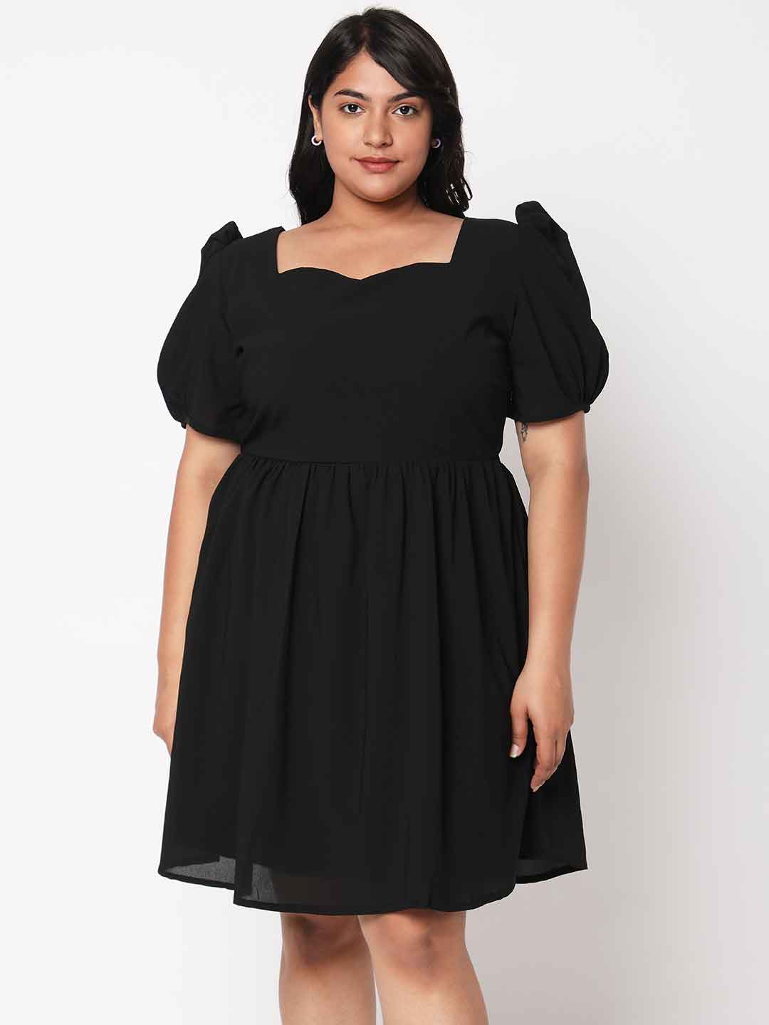 Solid sweetheart neckline fit and flared dress with puff sleeves and flared hem