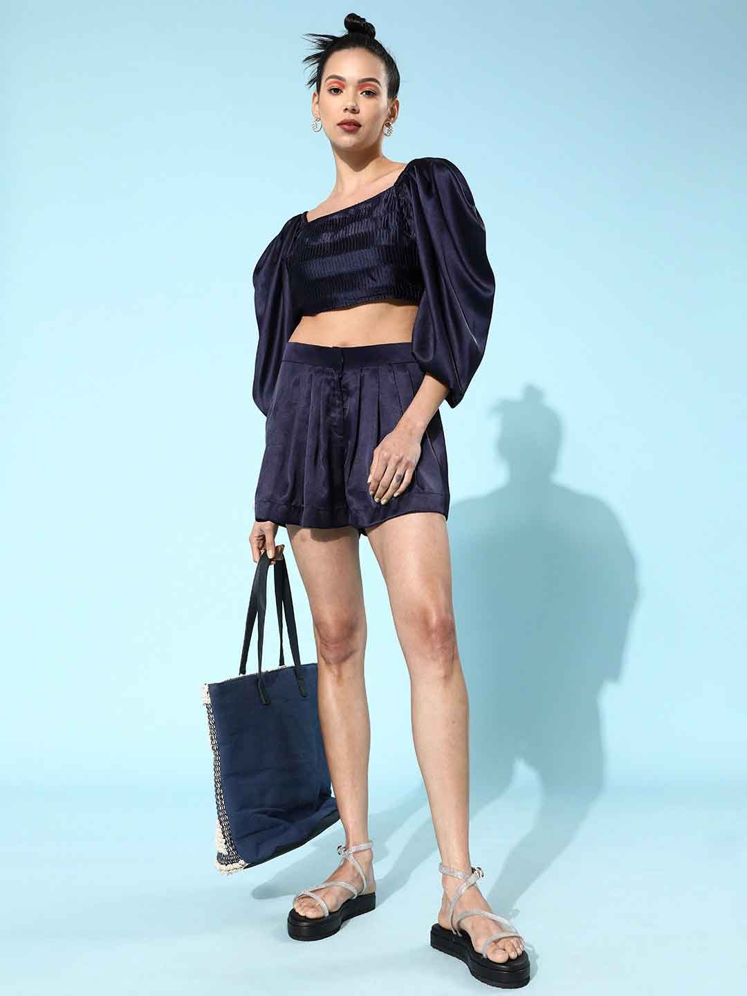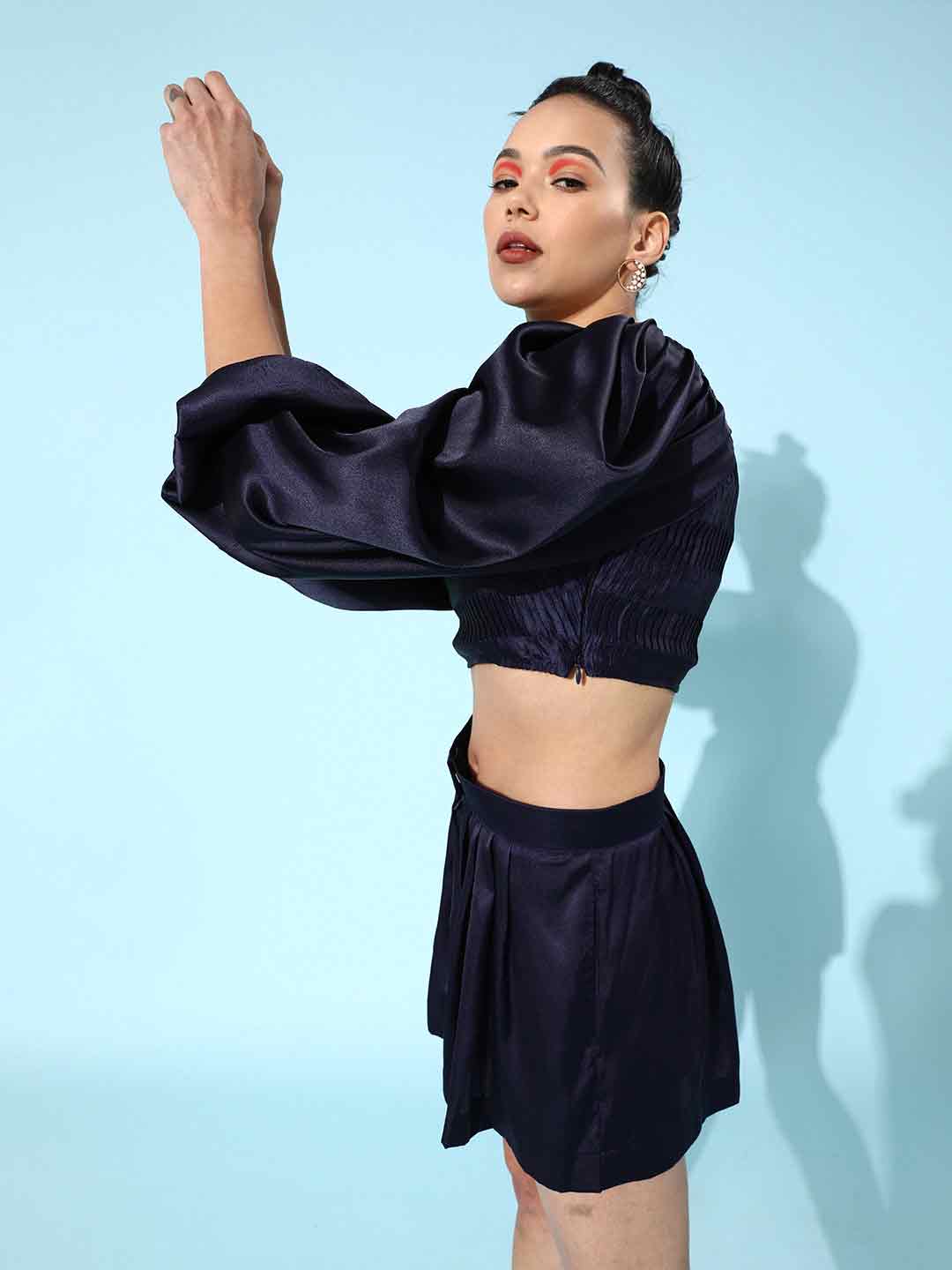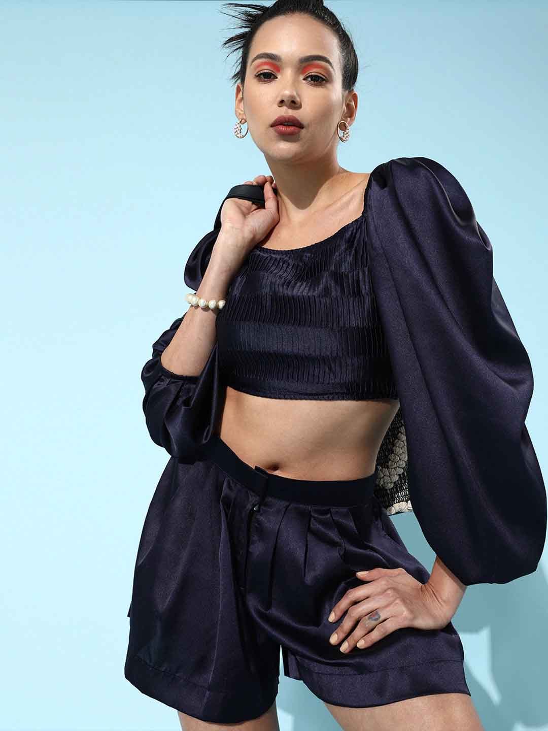 Navy blue textured style with full length puff sleeve crop top and flared style shorts